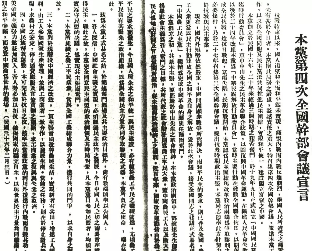 第四次全国干部会议发表宣言。谴责国民党在美帝国主义扶持下发动内战、破坏和平建国,呼吁全国同胞及民主党派共同推进团结,实现和平统一,建立富强之中国,并提出发展民主政治,实现社会主义,实现耕者有其田,由工人参加国家的生产管理等主张。