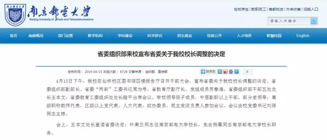 叶美兰同志任南京邮电大学校长,免去杨震同志南京邮电大学校长职务。