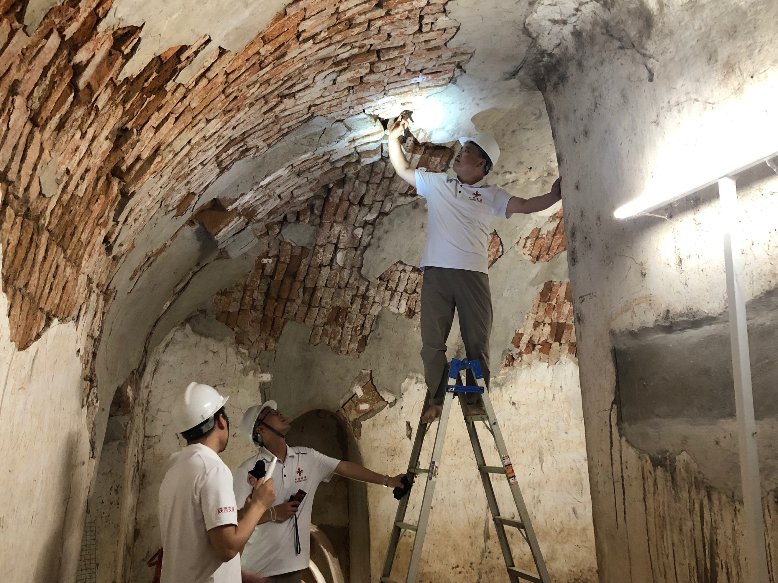 2019年5月2日,在缅甸蒲甘,中国专家在监测他冰瑜佛塔内部的裂缝和变形情况。