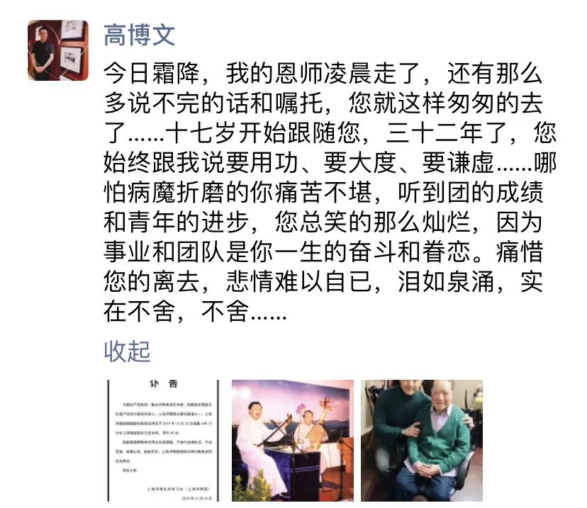 他不顾年事已高,40摄氏度的高温天气,也坚持骑脚踏车三十多分钟赶赴戏校为学生上课。上级领导想给他安排专车接送,他拒绝了:“我实在是不想麻烦他人。”上海评弹团的排练厅里也经常能看到他指导年轻一代“弹唱”的身影,小青年一个字咬得不准,一个音唱得不准,他都要叫停,并亲自演唱示范给学生们听。不仅如此,他更将自己几十年演出的传统长篇弹词《珍珠塔》整理出100回手抄本,无偿送给了徒弟高博文。