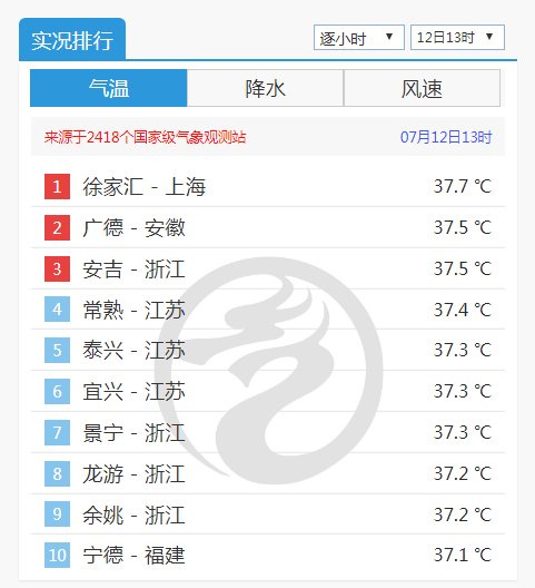 (原题为《37.7℃!下午一时,上海徐家汇制霸全国气温实况排行榜》)