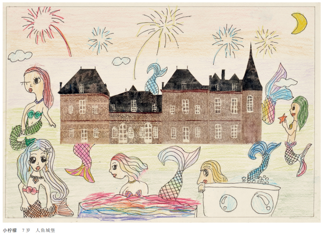 这幅《人鱼城堡》便是其中之一。“世界上有多少种人,海底里便有多少种不同色彩的美人鱼。”没有双脚但又与众不同的美人鱼,仿佛就是“星星的孩子”的写照,他们不被人所知的内心世界,也有属于自己的色彩。