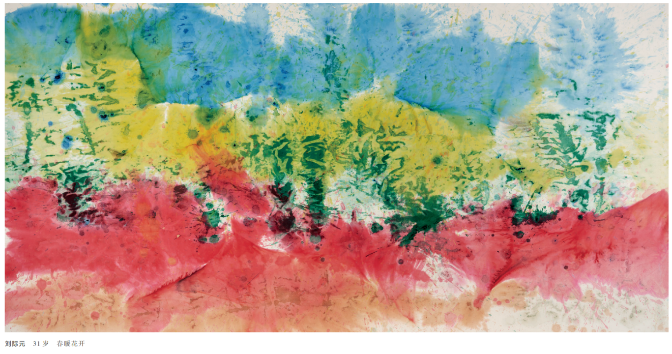 展厅入口处,一幅用色大胆、颜色绮丽的作品引人注目,泼墨式的蓝色、绿色、红色具有很强的视觉冲击力,仿佛带人走进了浪漫的花海,正如它的名字《春暖花开》,表现出旺盛的生命力。