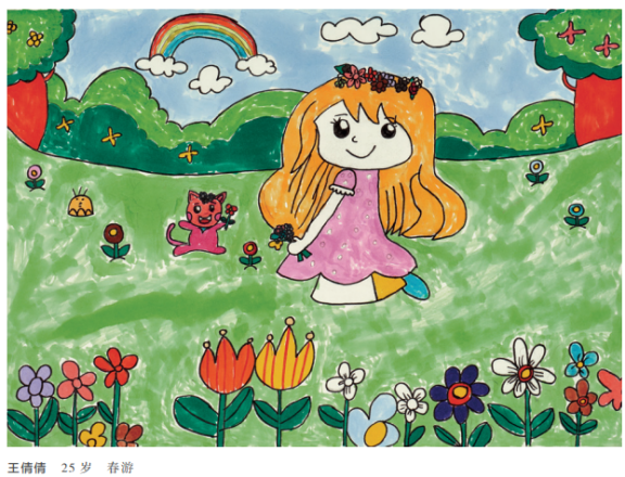 40岁的王鲁和25岁的王倩倩不约而同地画下了作品《春游》,画里有拥抱大自然的孩子,还有小动物、蓝天白云……常年为孤独症群体提供社区支持、培训的张锐说:“虽然年纪长大了,但孤独症群体喜欢用丰富的颜色,画出来很卡通,就像低龄的小朋友。当然,和我们一样,他们也喜欢美好的事物。”