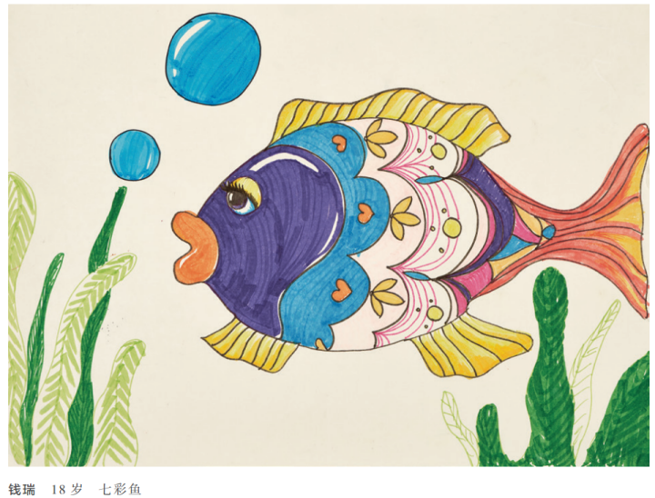 可爱的动物、美丽的花朵、身边的人们……这些都可以在孤独症群体笔下重新呈现。一只拥有多变鱼鳞和花纹的七彩鱼在画面上“游动”,创作者说:“我想有一天,我也可以变成它那样,穿上美丽的衣裳,自由自在地探索这个未知的世界,让所有人看到,我可以穿过珊瑚丛,越过高山峰,热爱这个世界!”