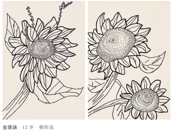 《朝阳花》作品中,以线条和点为主要元素的花朵高高地昂起了头,向着太阳而生。“每一个星星的孩子也跟它一样,对生活充满了爱与希望。”