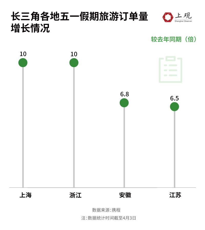 在长三角地区,上海、浙江的旅游复苏态势较国内其他地区更旺,截至4月3日,上海、浙江的“五一”假期旅游订单量较去年同期分别增长10倍。