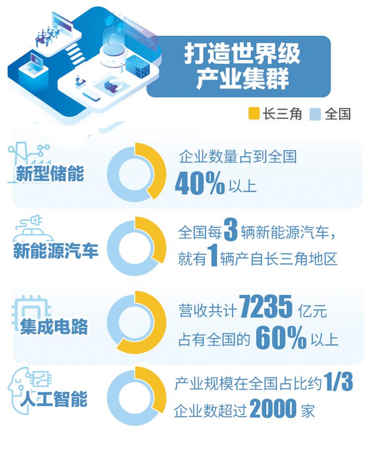 长三角集成电路的总营收占到全国60%以上,全国超3000家与生物技术、制药相关的企业,接近一半都位于长三角。近来备受瞩目的人工智能产业规模在全国占比约为三分之一,企业数在全国占比达到30%。新能源汽车产业方面,全国每3辆新能源汽车中,就有1辆产自长三角地区。