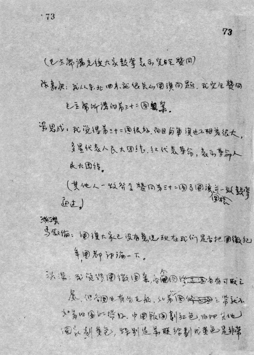 1949年9月23日上午9时,国旗国都纪年分组讨论第十一组会议记录:主席是廖承志、梁思成。实到人数52人。关于国都意见:一致同意定都北平并改名北京。