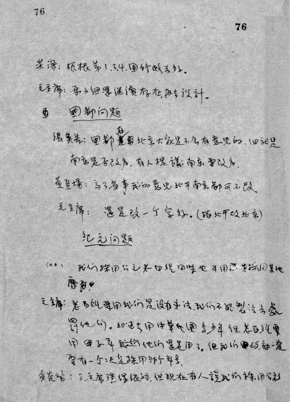 1949年9月25日下午8时,在中南海丰泽园,举行国旗国徽国歌纪年国都协商会座谈会。在这个座谈会上,关于国都问题,张奚若说:国都定在北京大家是不会有意见的,但就是南京是否要改名,有人提议南京要改名。毛主席说:还是改一个字好(指北平改北京)。关于纪年问题,我们采用公元,老百姓同样也可用,也可采用其他历。毛主席:老百姓要用我们是没有办法,我们不能处罚他们。如过去用中华民国多少年,但老百姓要用甲子年,他们还是用了。但我们政府一定要有一个决定采用哪个年号。黄培炎说:毛主席讲得很对,但现在有人说我们采用公元是基督教的年号,其实许多基督教国家都采用了公元。毛主席说:就是耶稣也不坏,耶稣和今天所推行之基督教之帝国主义并不一样。