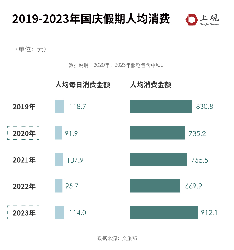 根据文旅部的数据计算,今年“双节”人均消费金额为912元,相比今年端午和五一假期,已有较大增幅,分别增长了159.1%、68.8%。