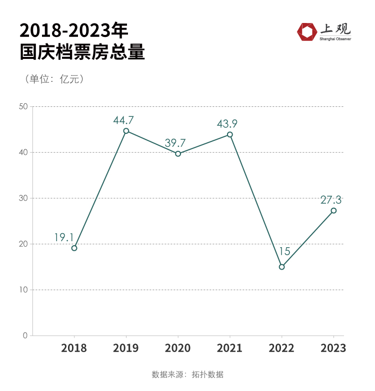 根据拓普数据,假期间放映场次达353.1万场,较2019年同期增长35%,票价增长了11.4%,但全国票房收入仅有27.31亿元,近五年来仅高于2022年,相比2019年下降了38.8%。