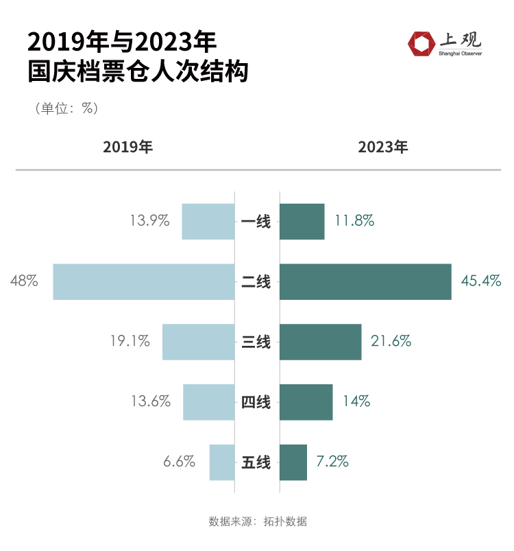 与2019年相比,今年国庆档的票仓人次结构体现出明显的下沉趋势,三线及以下市场占比上升显著。