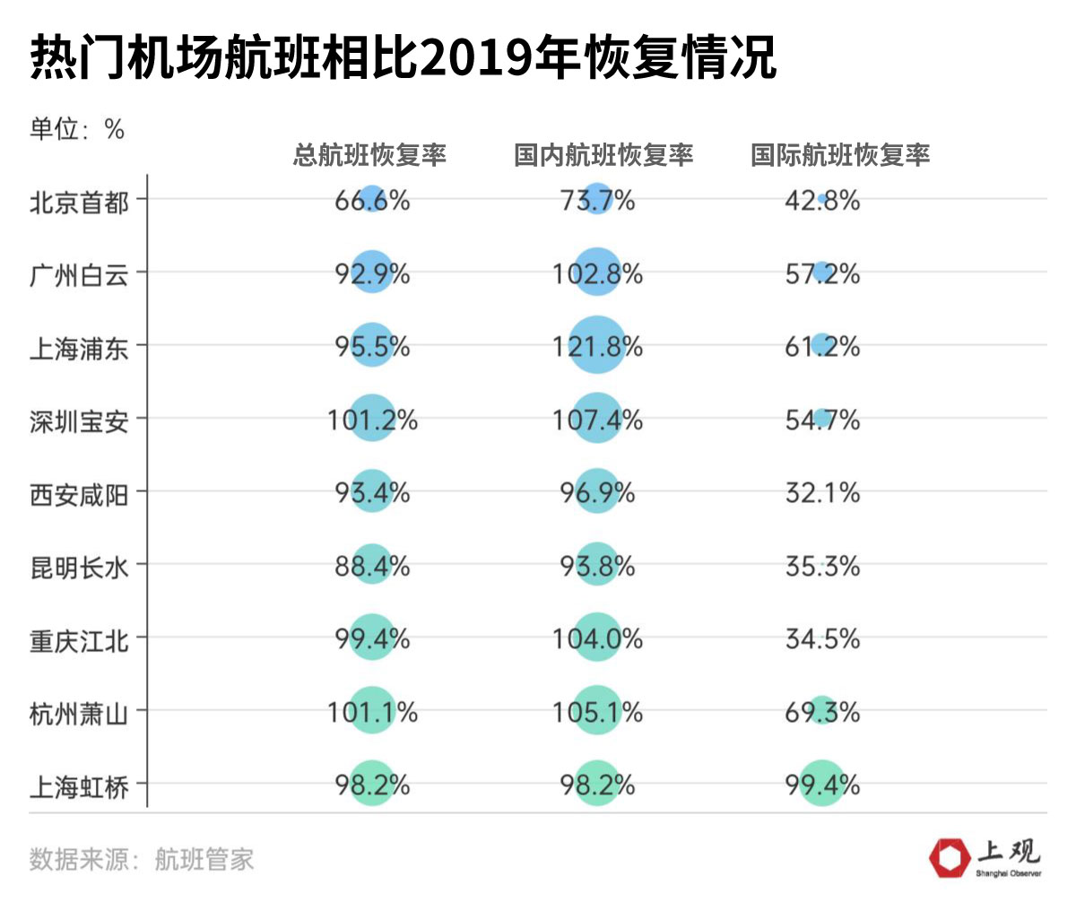 以上海浦东为例,今年9月的国内航班总量已经超出2019年同期21.83%,而国际航班仅恢复至疫情前的六成。
