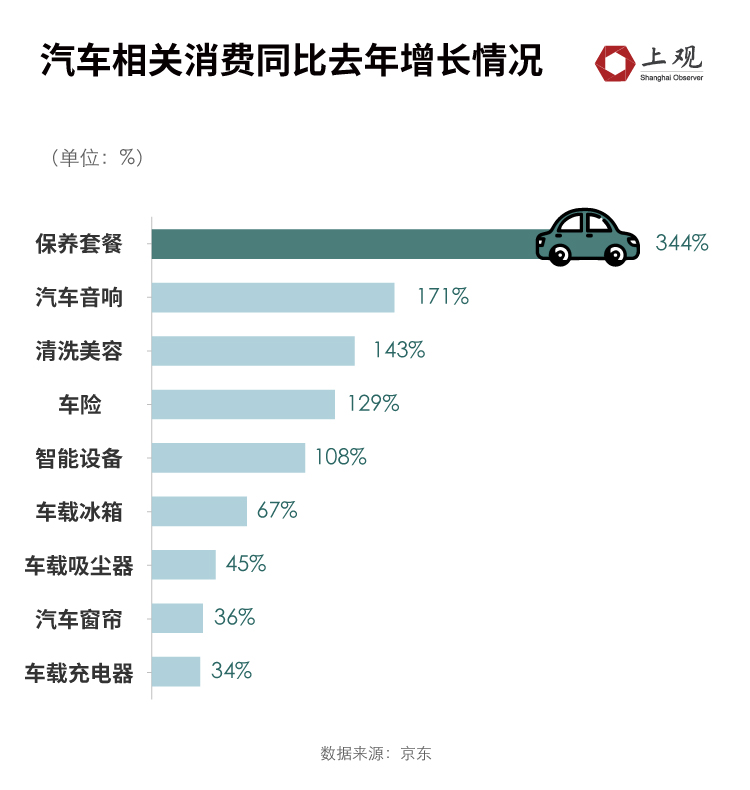 长途旅行可能会对车辆零部件造成损耗,因此汽车保险、应急设备的消费需求也有所增长。数据显示,在京东平台上,轮毂配件的销量同比增长137%,拖车绳、检修灯也分别增长了34%、33%。
