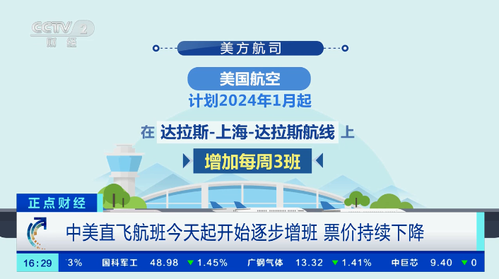 中国航司中,国航、东航、南航、海航、川航,多家航司在多条航线上均有增班。美方航司方面,2023年11月起美联航计划在旧金山-北京-旧金山航线上增加每周4班;美国航空也计划从2024年1月起在达拉斯-上海-达拉斯航线上增加每周3班。