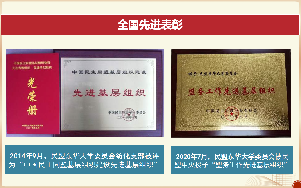 从由张闻骏、程守洙、吾葆真、周承佑等9位盟员最早组成的盟组织开始,历经风风雨雨,发展成为如今学校规模最大、最有影响力的民主党派组织,拥有7个支部和264名盟员。当初风华正茂的青年变成了如今白发苍苍的耄耋老人和正值当打之年的“中坚力量”,为盟组织作出了重要的贡献。