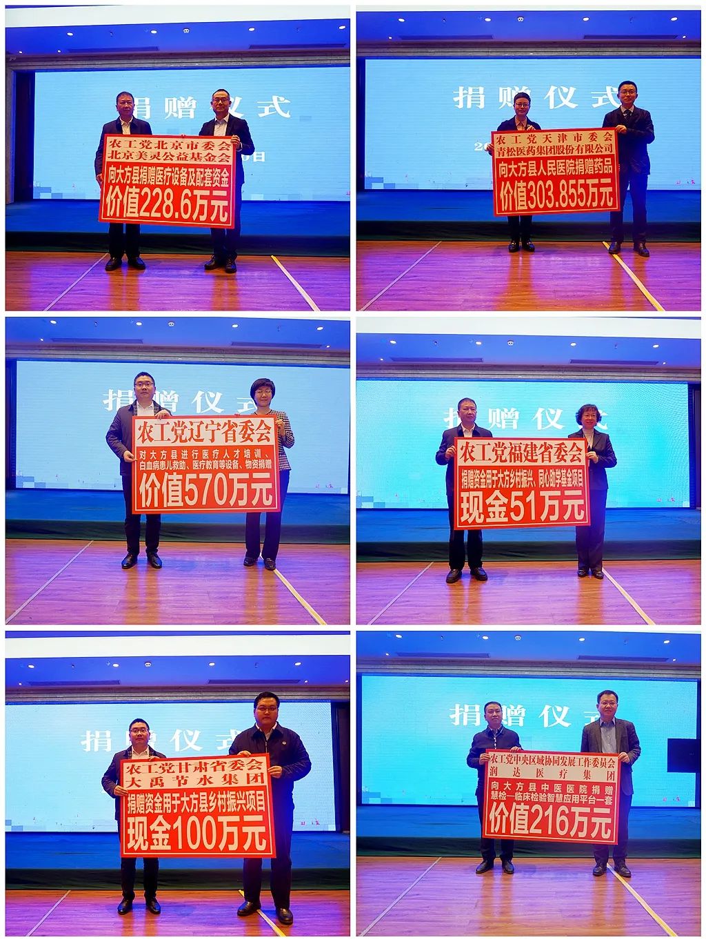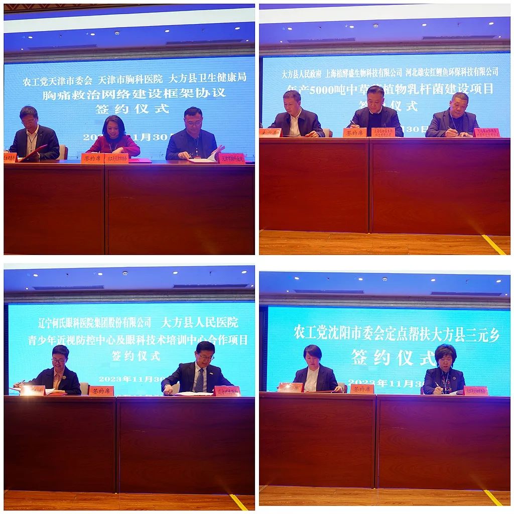 会上,举行了天津市胸科医院、上海植酵盛生物科技有限公司、辽宁何氏眼科、农工党沈阳市委会帮扶大方县的签约仪式。农工党北京市委会、天津市委会、辽宁省委会、福建省委会、甘肃省委会、大禹节水集团、农工党中央区域协同发展工作委员会、润达医疗集团向大方县捐赠了物资款项。