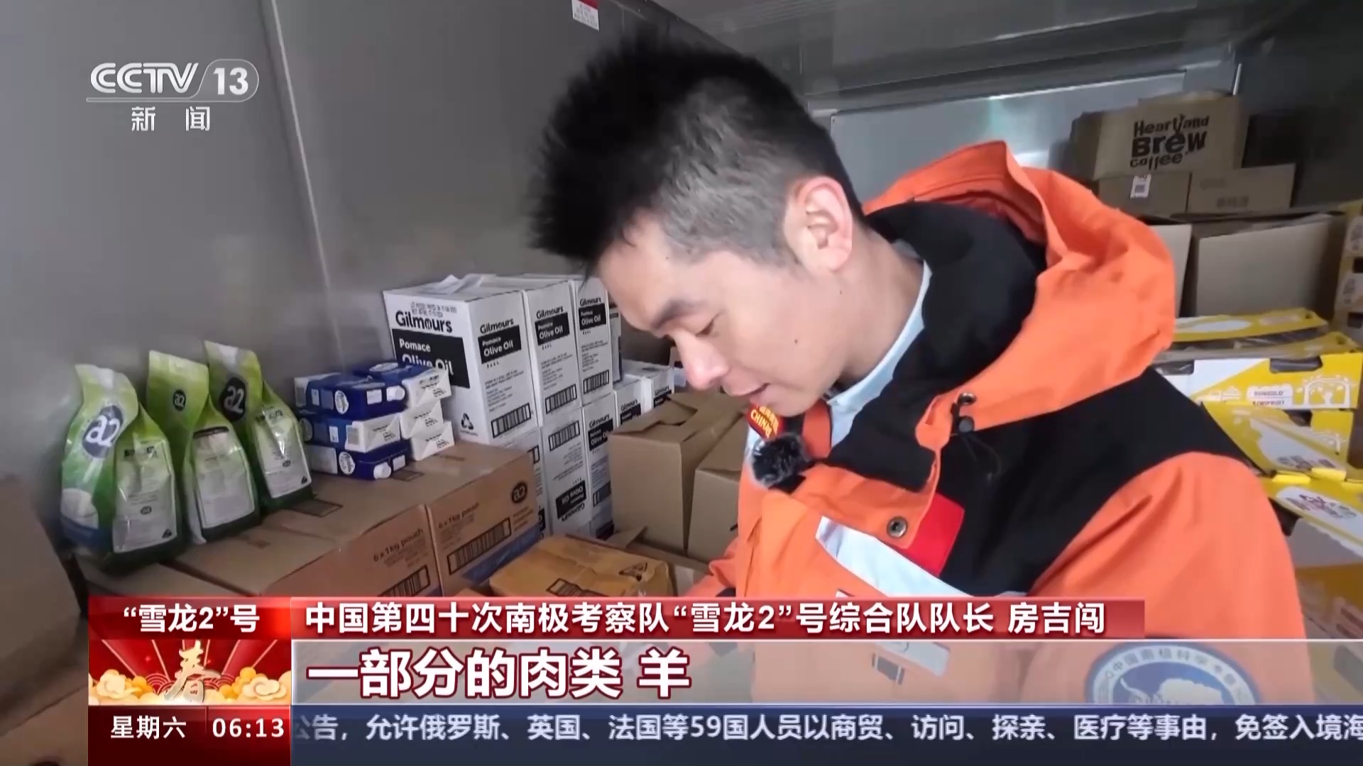 中国第四十次南极考察队“雪龙2”号综合队队长 房吉闯:大多数是蔬菜和水果,一部分的肉类、羊还有些水、巧克力啥的,再就是春节的一些装饰用品。
