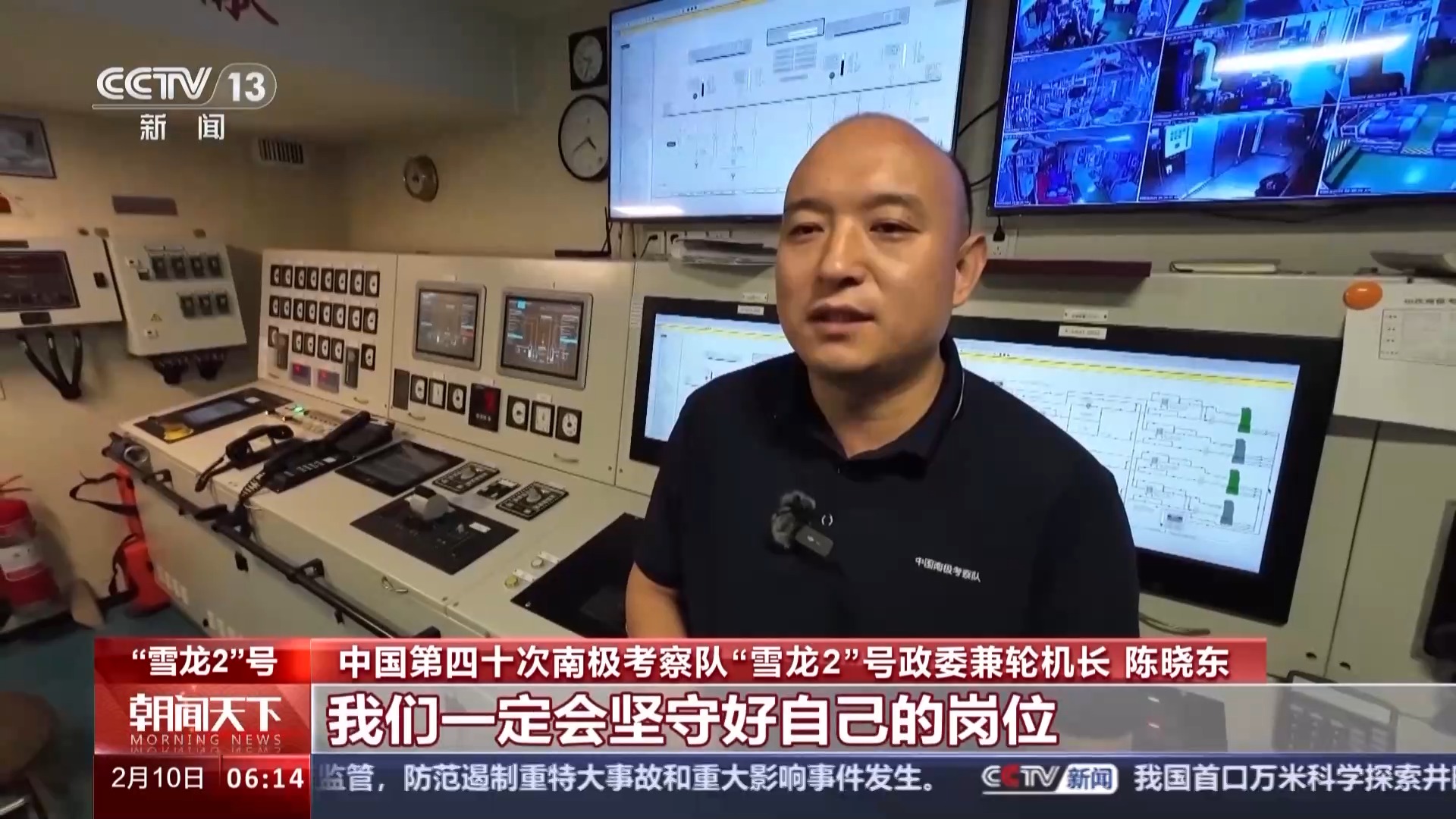 中国第四十次南极考察队“雪龙2”号政委兼轮机长 陈晓东:我们国家这些年一直在持续探索南极,所以总要有一部分人来到南极执行任务。我作为其中一分子,很荣幸,见证了我们国家南极考察这些年的成果。同时也请祖国人民放心,我们一定会坚守好自己的岗位,作出自己的贡献。