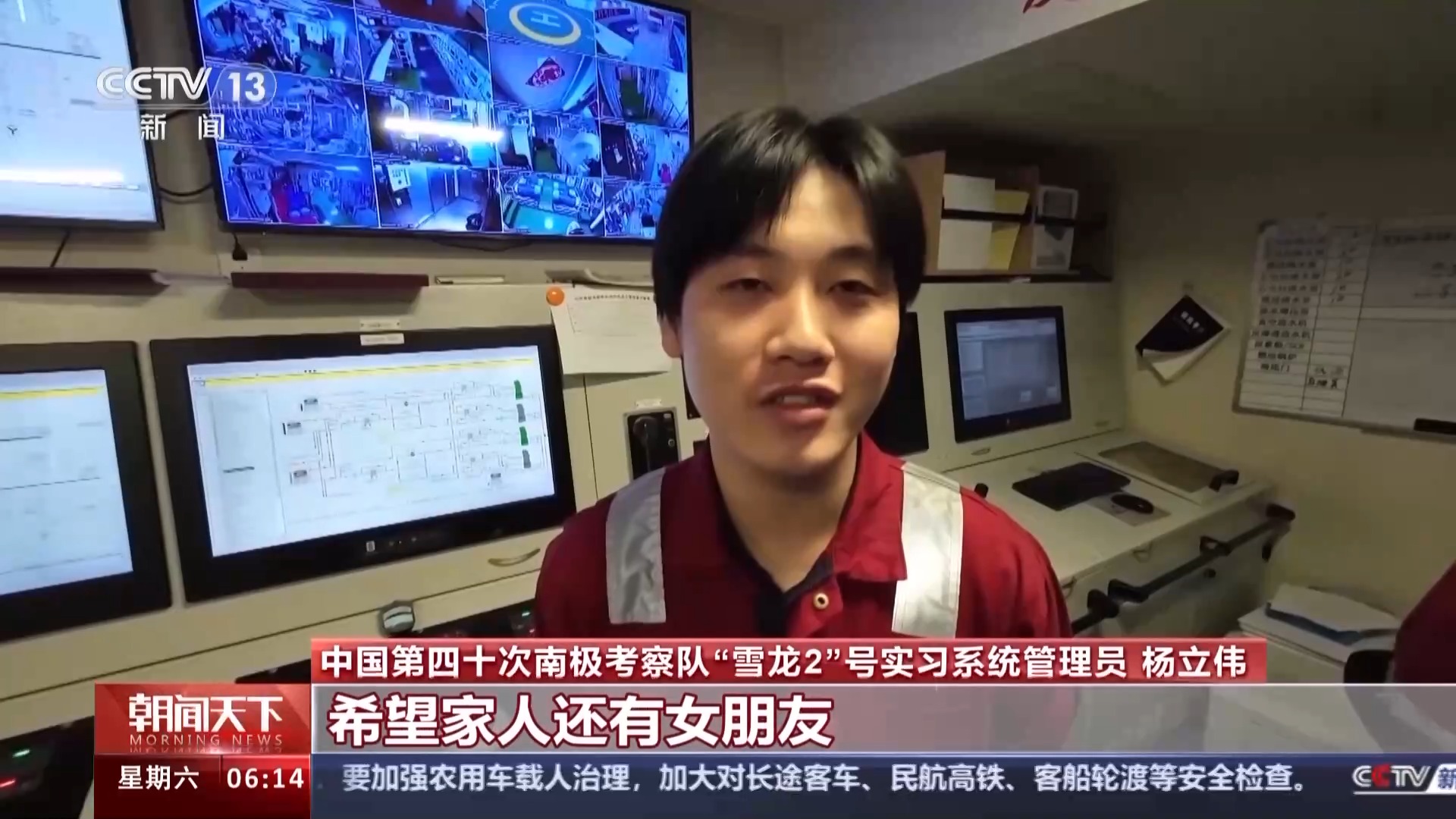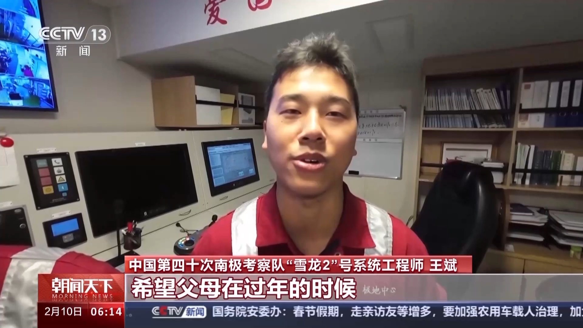 中国第四十次南极考察队“雪龙2”号系统工程师 王斌:希望父母在过年的时候能有一个欢乐的氛围,不要过于想念我,我在南极这边一切都很好。