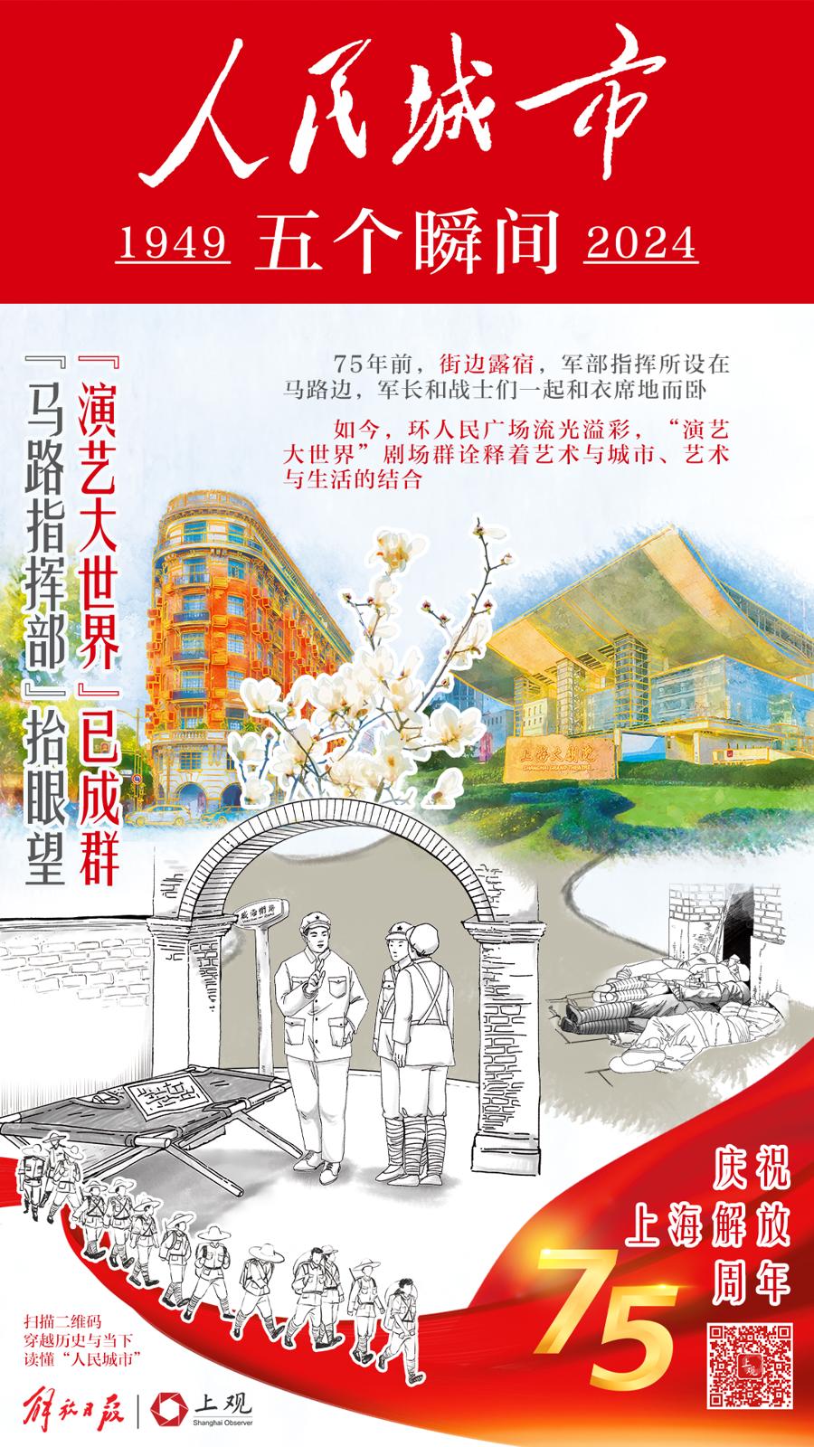 75年前,街边露宿,威海路黄陂路路口,军部指挥所设在马路边,军长和战士们一起怀抱枪支、和衣席地而卧。不入民宅是人民解放军送给上海人民的“见面礼”。如今,环人民广场流光溢彩,“演艺大世界”剧场群诠释着艺术与城市、艺术与生活的结合,市民游客在此享受高品质文化供给。