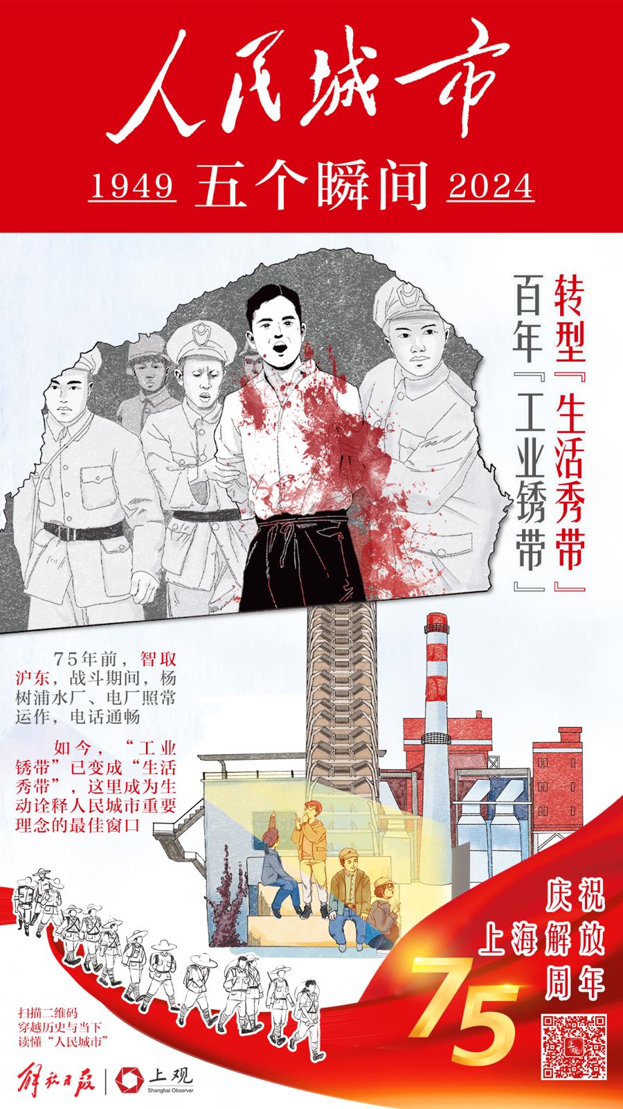 75年前,智取沪东,战斗期间,杨树浦水厂、电厂照常运作,马路上电车、公共汽车正常行驶,电话通畅。如今,昔日“工业锈带”已变成“生活秀带”,这里成为生动诠释人民城市重要理念的最佳窗口。