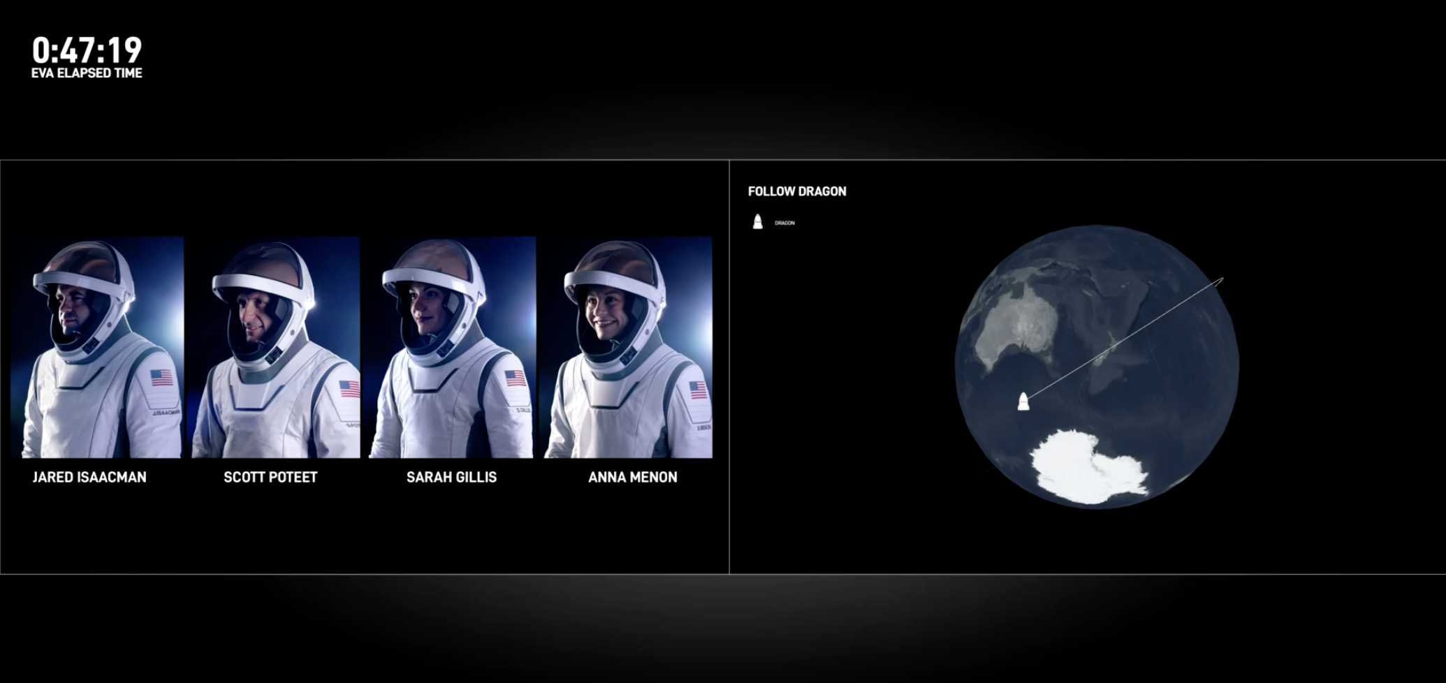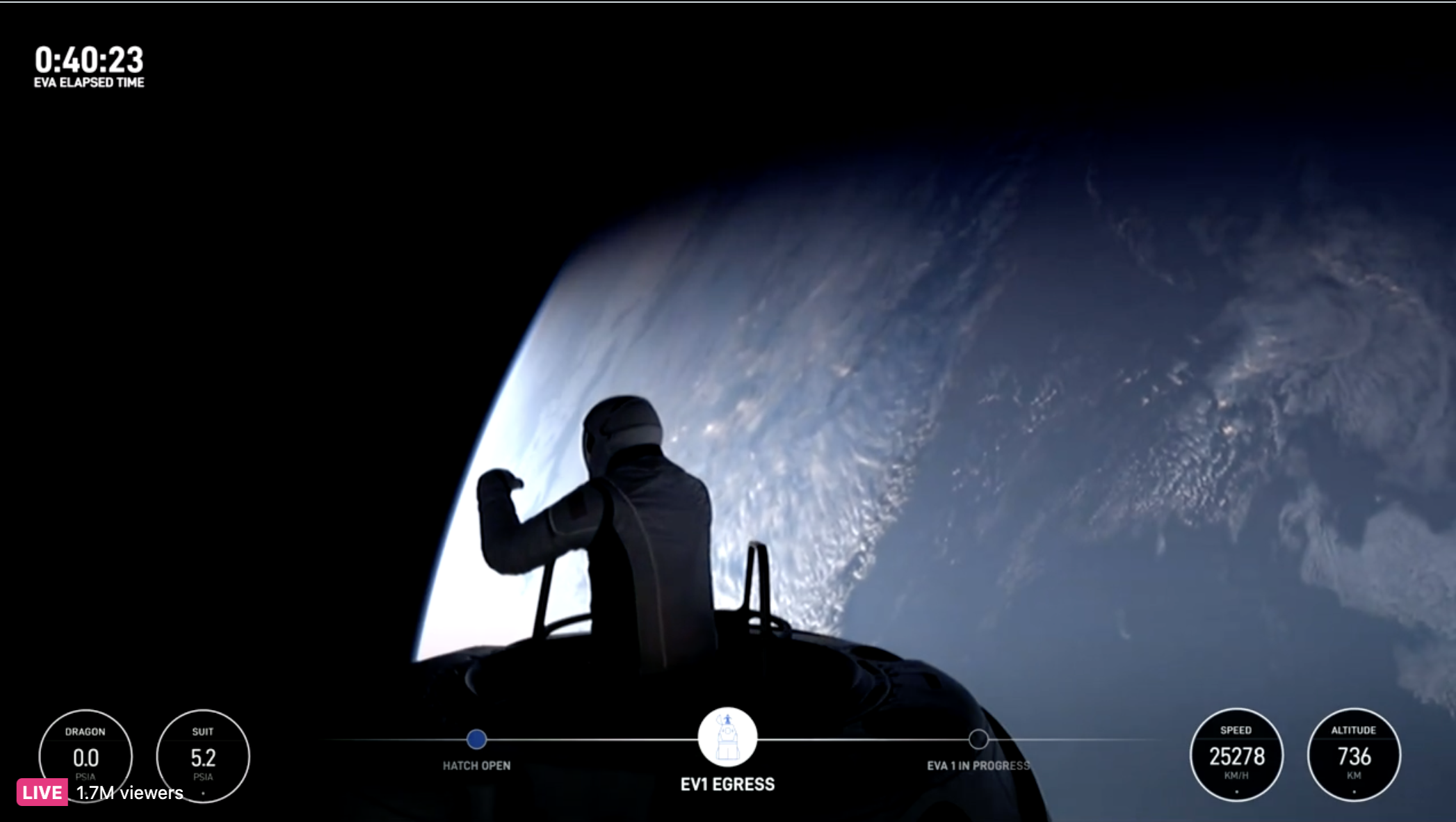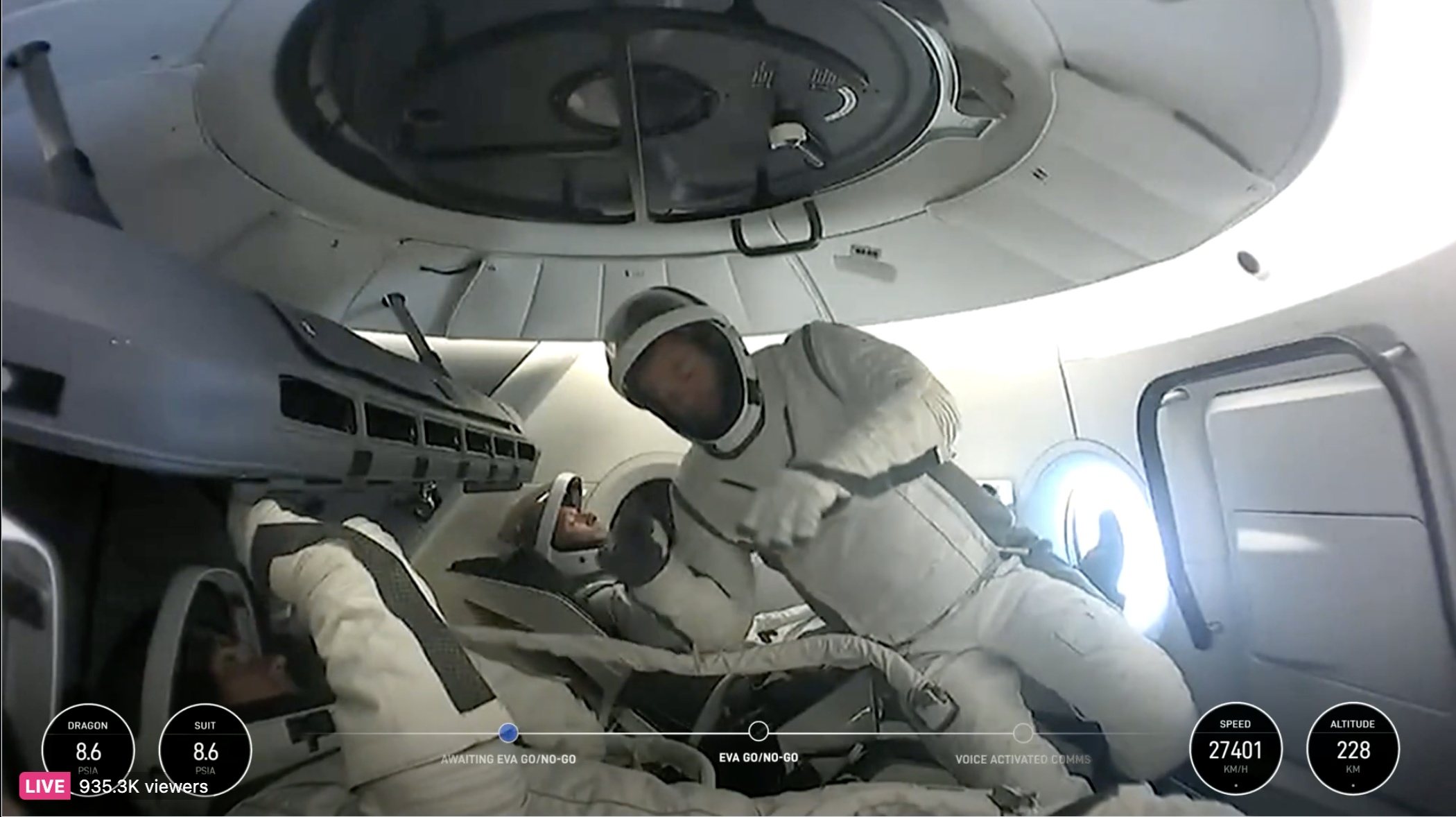 在宇航员们穿上舱外宇航服后,SpaceX正式开始直播,画面分享了龙飞船太空舱内部的景象。可以在背景中看到波提特坐在座位上,而任务指挥官艾萨克曼则飘浮在空中,连接着一条“脐带”。
