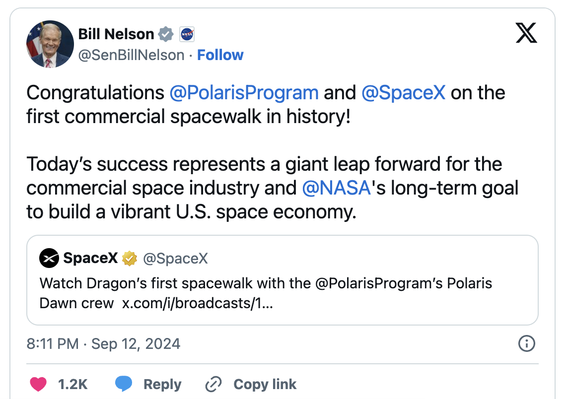 任务结束后,美国宇航局局长比尔·尼尔森(Bill Nelson)向北极星黎明团队和SpaceX发出了祝贺,称此举为“巨大飞跃”。