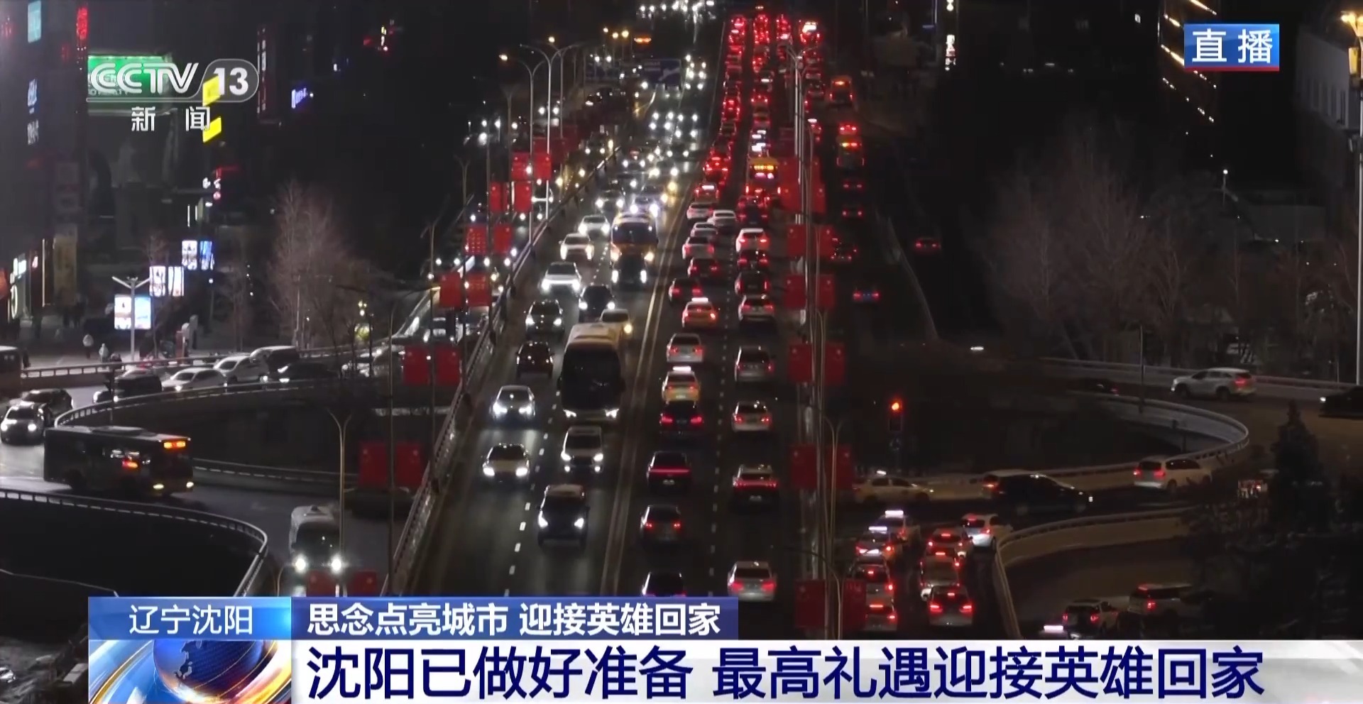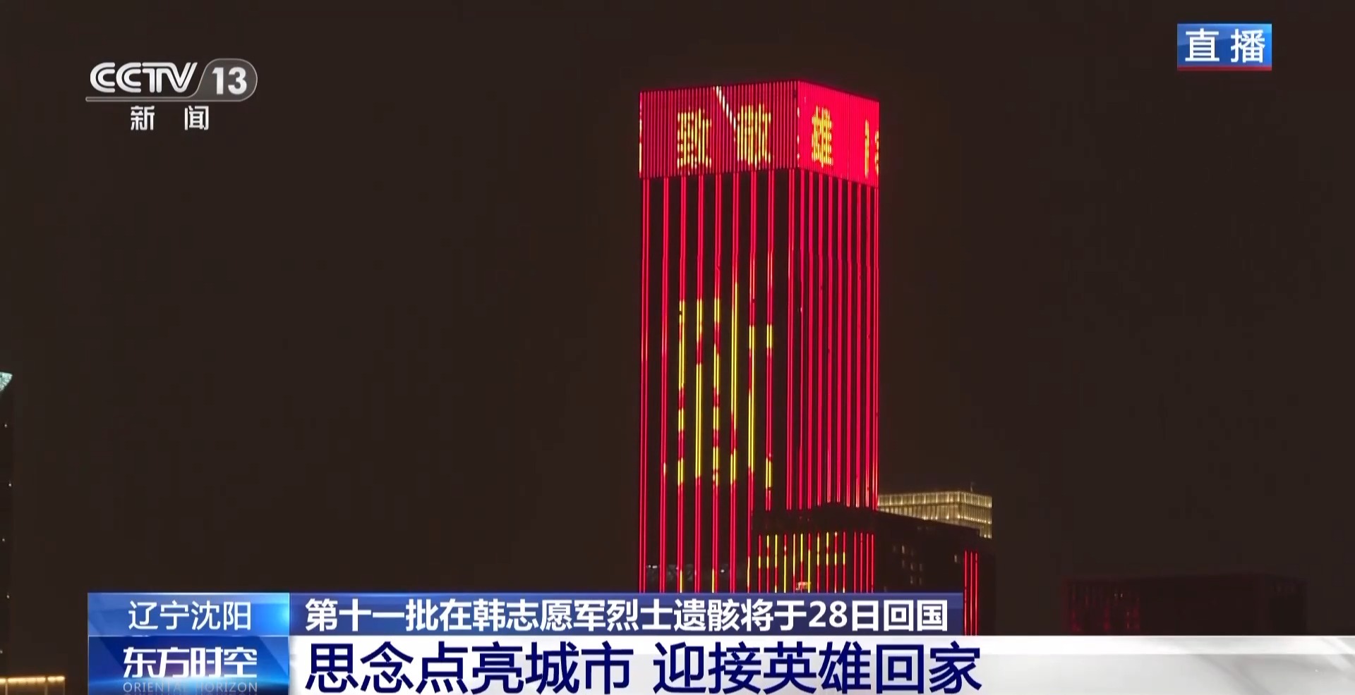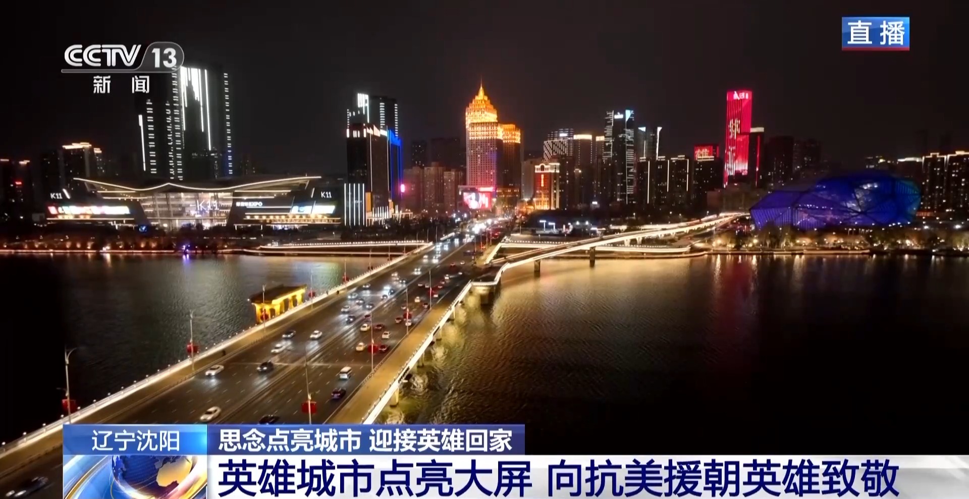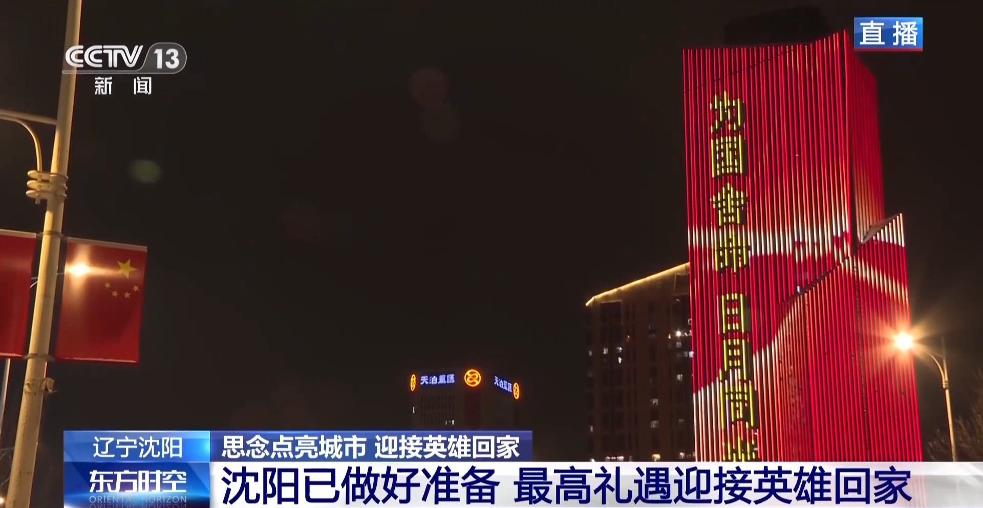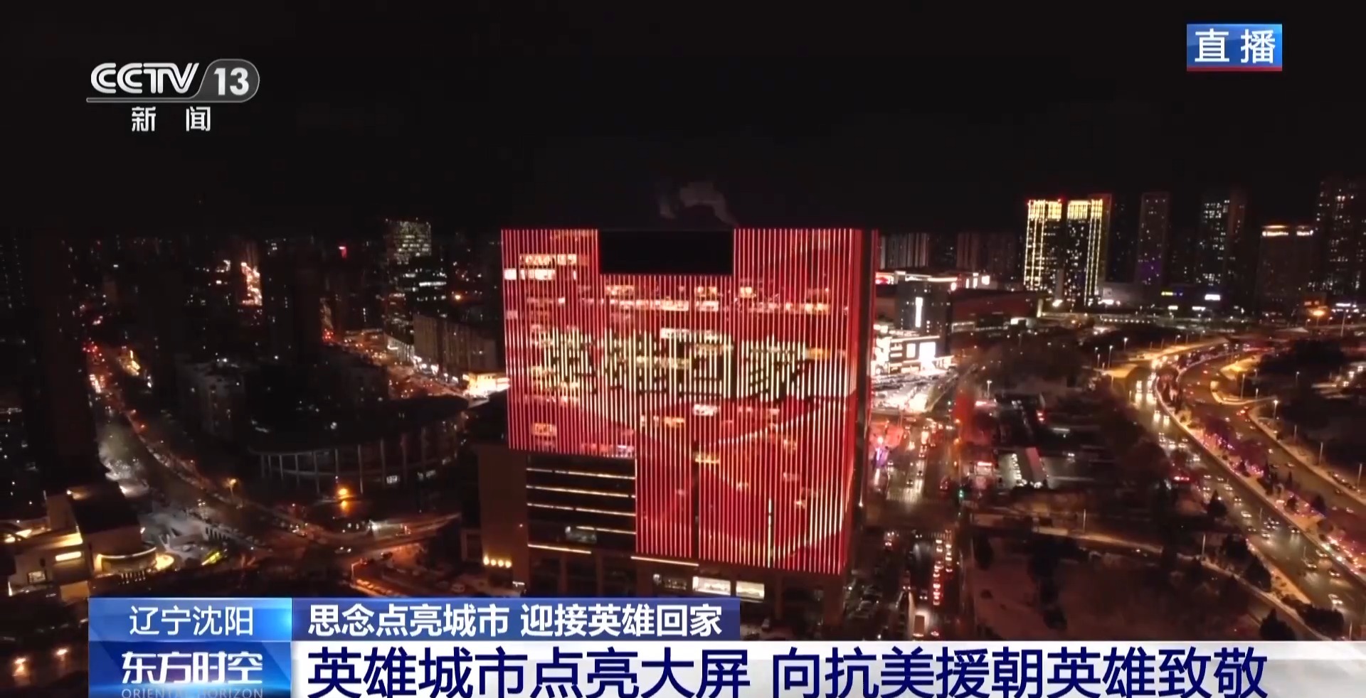 总记者 贾铁生:沈阳这座英雄城市,这两天提前点亮了全城主要街道的大屏幕,向英雄致敬,迎接第十一批在韩中国人民志愿军烈士遗骸回家。