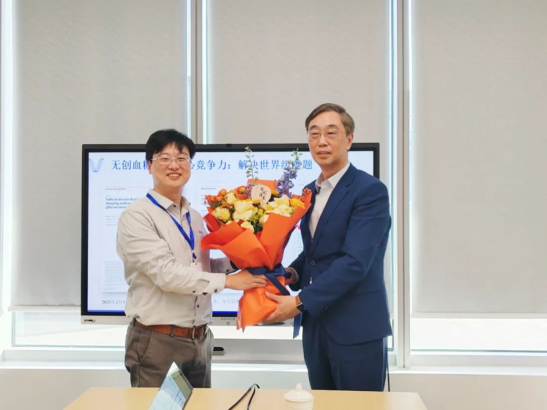 宝山区政协委员陈昌团队参与合作的无创血糖检测技术获得重大突破,区政协主席凌惠康走访致贺