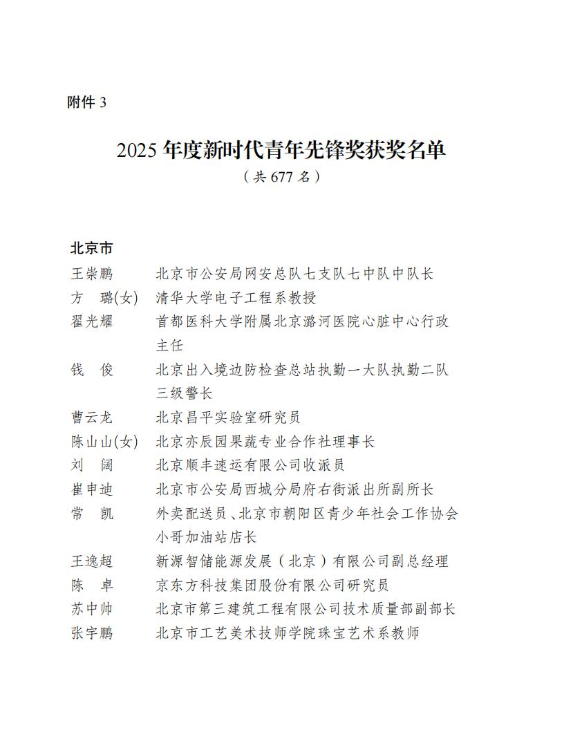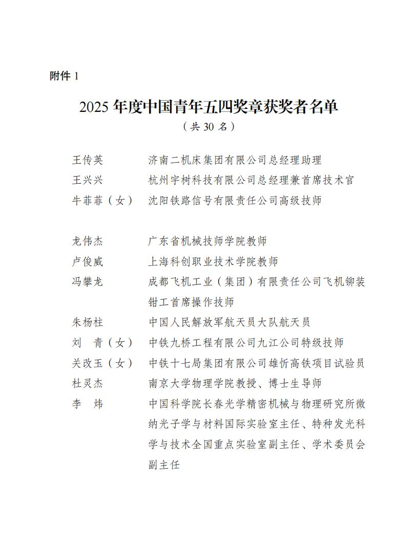 附件:1. 2025年度中国青年五四奖章获奖者名单