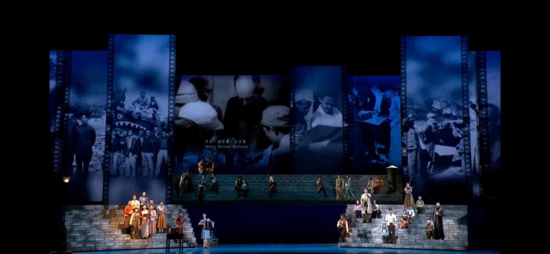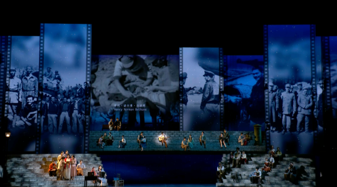 歌曲《红河谷》中,八路军总政治部电影团(又称延安电影团)成员吴印咸当年现场拍下的白求恩大夫手术场景呈现在观众面前,与现场演职人员的表演相结合,呈现出更好的舞台效果。