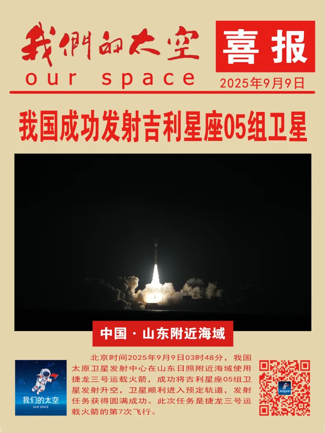 北京时间2025年9月9日03时48分,我国太原卫星发射中心在山东日照附近海域使用捷龙三号运载火箭,成功将吉利星座05组卫星发射升空,卫星顺利进入预定轨道,发射任务获得圆满成功。此次任务是捷龙三号运载火箭的第7次飞行。