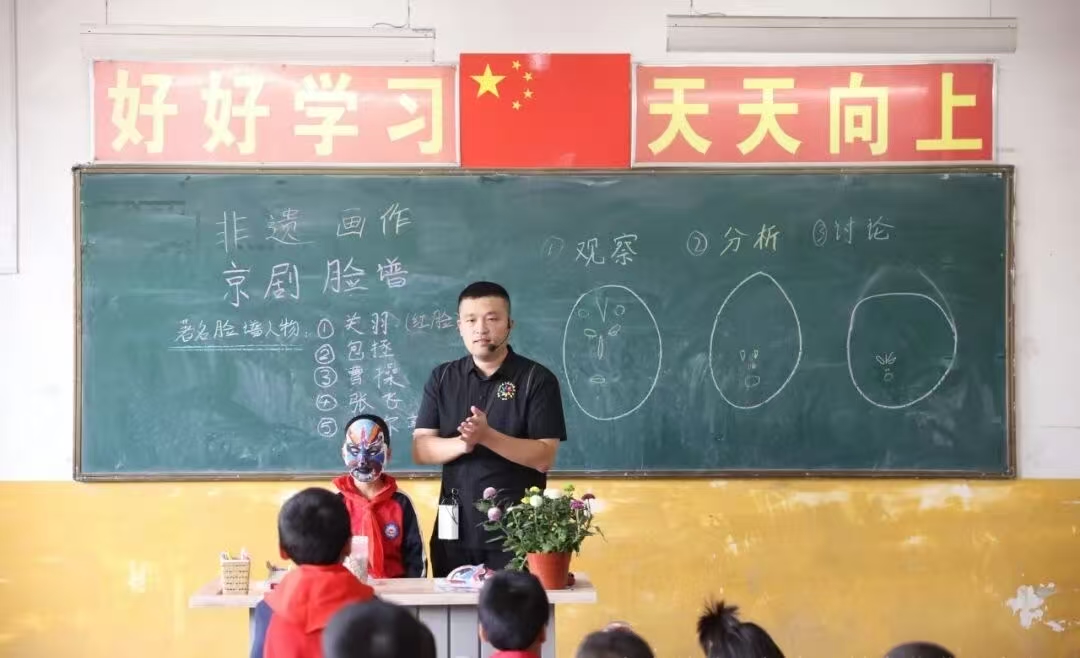 精心打磨每一份教案,倾心准备每一堂课程,只想把最鲜活、最有温度的知识,传递给孩子们。援教的日子里,杨飞创新性地将非遗文化与趣味科技手工融入课堂,让书本知识变得生动可感。面对充满好奇心的二年级学生,杨飞精心准备了京剧脸谱这一经典非遗元素,带领孩子们开启了一场奇妙的传统文化之旅。课堂上,当他拿出色彩鲜艳的脸谱道具,一个个鲜活的角色,瞬间勾起了孩子们对知识的好奇心。