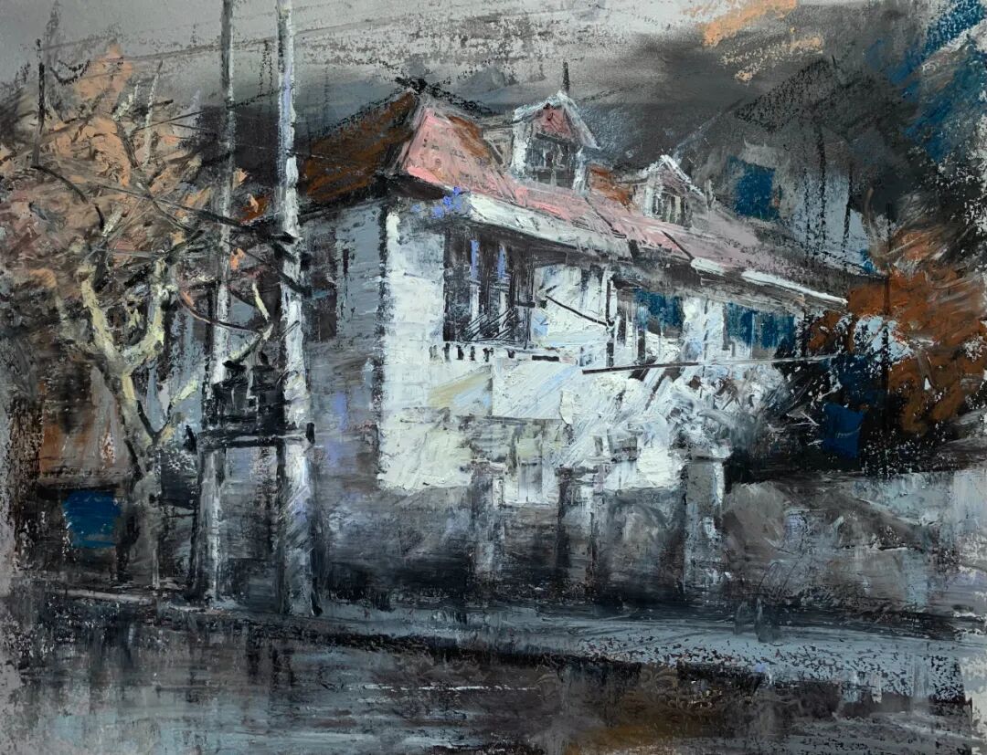 有一年秋天的一个午后,我偶然来到衡复街区,被午后阳光照射下的历史文化名人街区的建筑深深吸引,武康路、高安路、湖南路等多条马路,狭窄的街道两旁依然是风情万种的梧桐树掩映着一幢幢老洋房,还有藏着时光印记的老弄堂,以前也多次去过这个地区,但这次感觉不一样,有一种老建筑重获新生感,有一种想画的冲动。于是,后来陆陆续续去了几次,用油画棒一一记录下来。