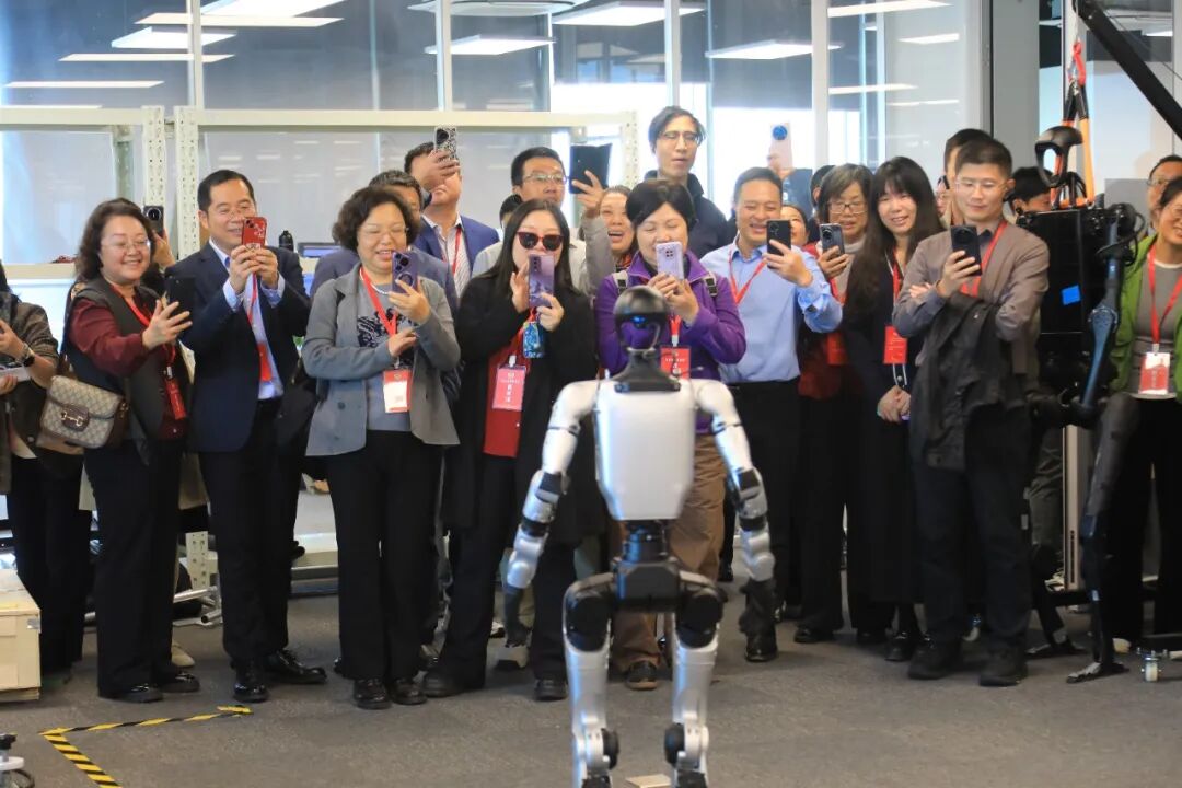 在上大通用智能机器人研究院,由宇树科技自主研发的人形机器人担任“向导”,带领委员们来了一场科技感十足的参观之旅。委员们近距离接触机器人领域前沿技术与科研成果,通过与机器人互动、观看功能演示,直观感受宝山通过整合政、校、企三方资源优势,在人形机器人、四足机器人产业领域实现政产学研深度融合所释放的创新实力。