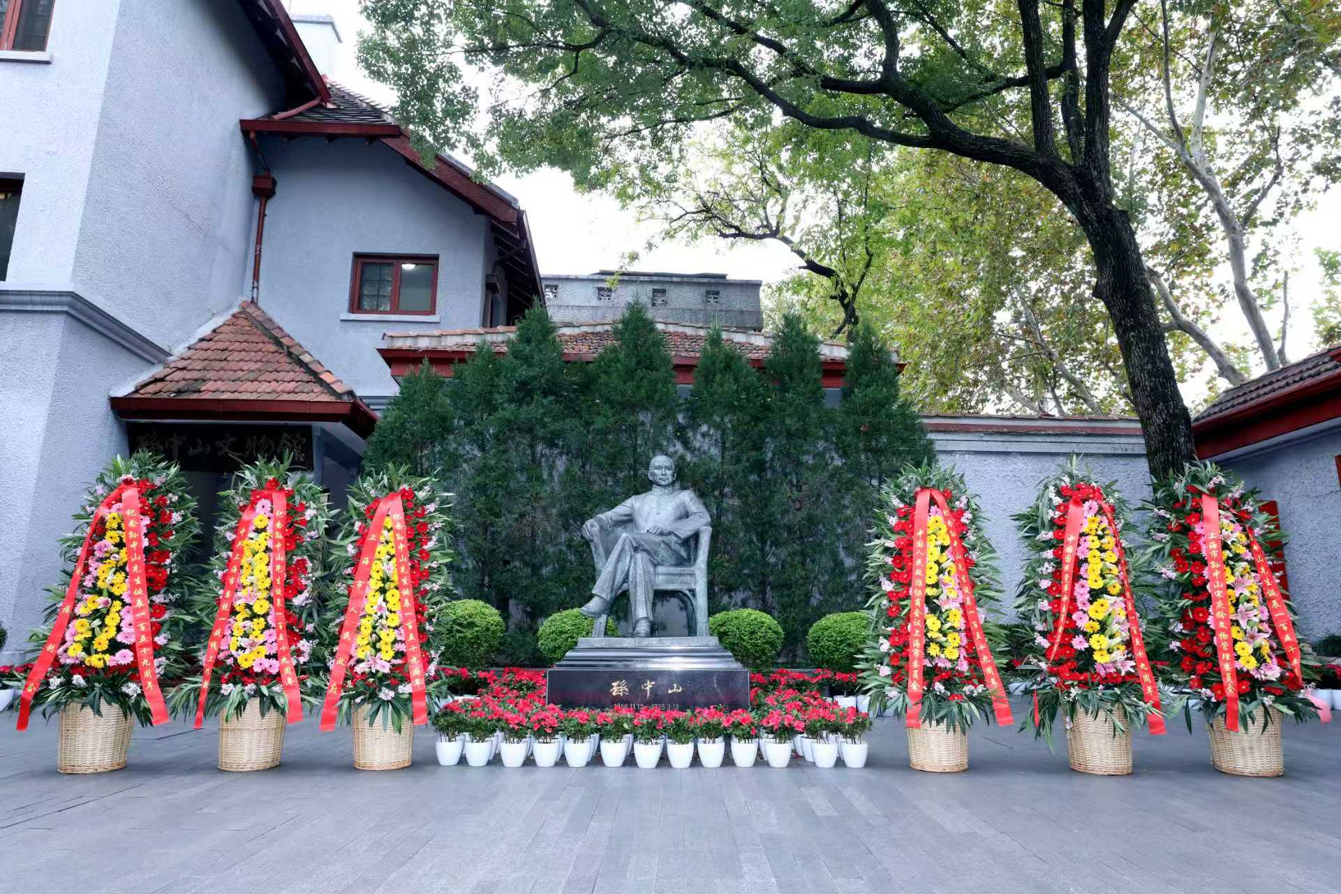 在孙中山故居庭院中央,摆放着上海市政府、市政协、中共上海市委统战部、民革上海市委和中国福利会等敬献的花篮。市领导陈通、陈靖、徐毅松、解冬、肖贵玉与参加纪念活动的各界人士一道,在孙中山先生铜像前肃立并行三鞠躬礼。