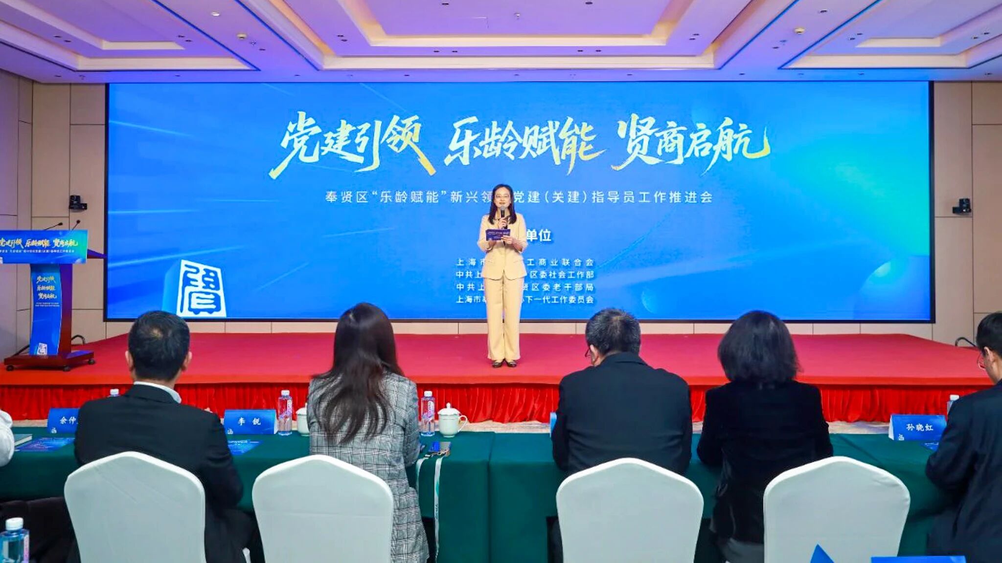 11月10日下午,奉贤区工商联、区委社会工作部、区委老干部局、区关心下一代工作委员会联合举办“党建引领 乐龄赋能 贤商启航”——奉贤区“乐龄赋能”新兴领域党建(关建)指导员工作推进会。区委副书记唐晓腾,市工商联党组成员、副主席封丹华,区委常委、组织部部长胡煜昂,区委常委、统战部部长李锐等出席。市工商联、市委社会工作部、市委老干部局相关处室负责同志,各相关委办局、各街镇(旅游区)、相关集团公司分管负责同志,各街区党组织书记和指导员代表,党建(关建)指导员,区工商联所属商会会长、秘书长,楼宇、园区、产业集群、行业协会、重点企业、新就业形态负责人代表等共计120余人参加活动。