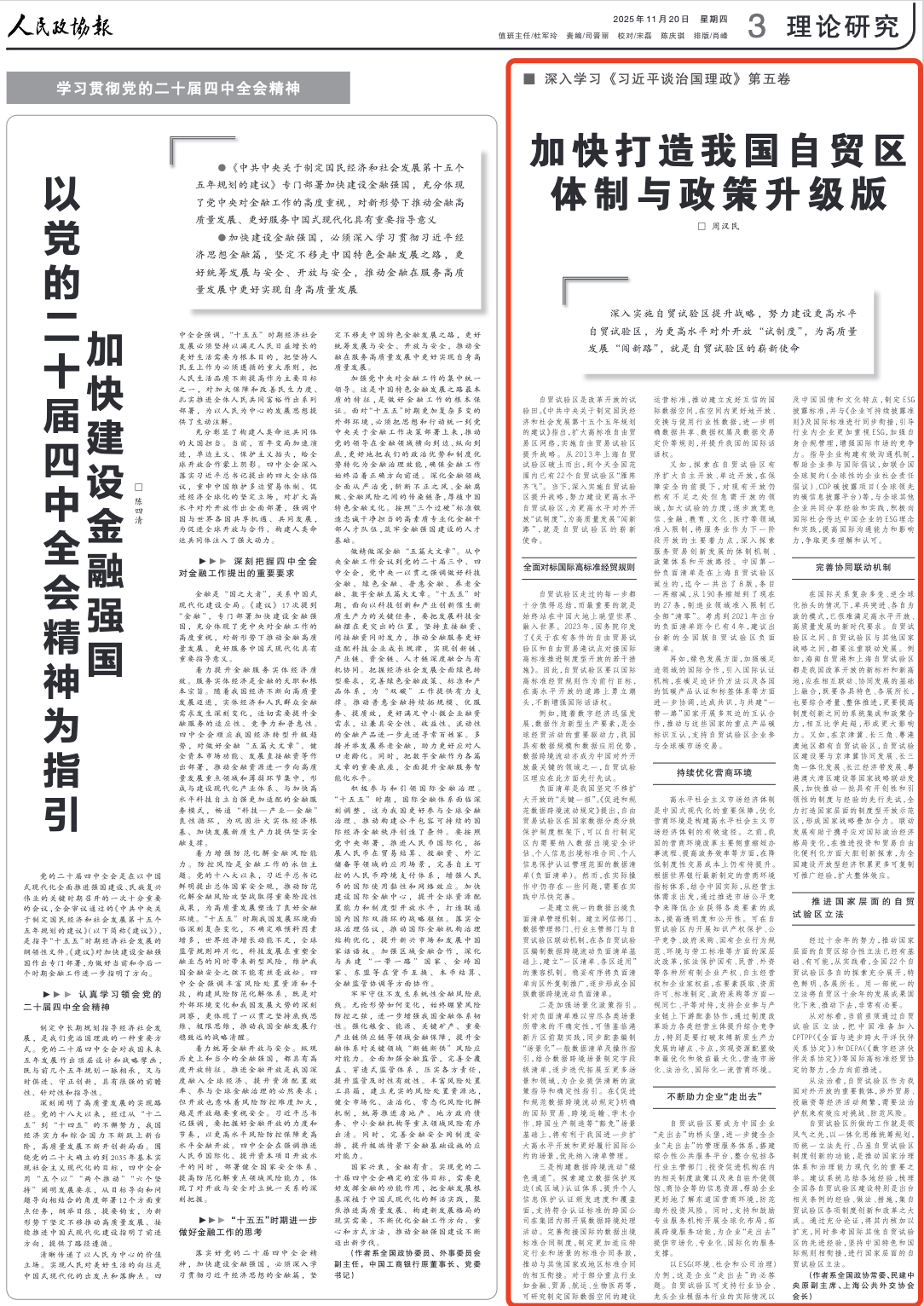 人民政协报关注|全国政协常委周汉民:加快打造我国自贸区体制与政策升级版