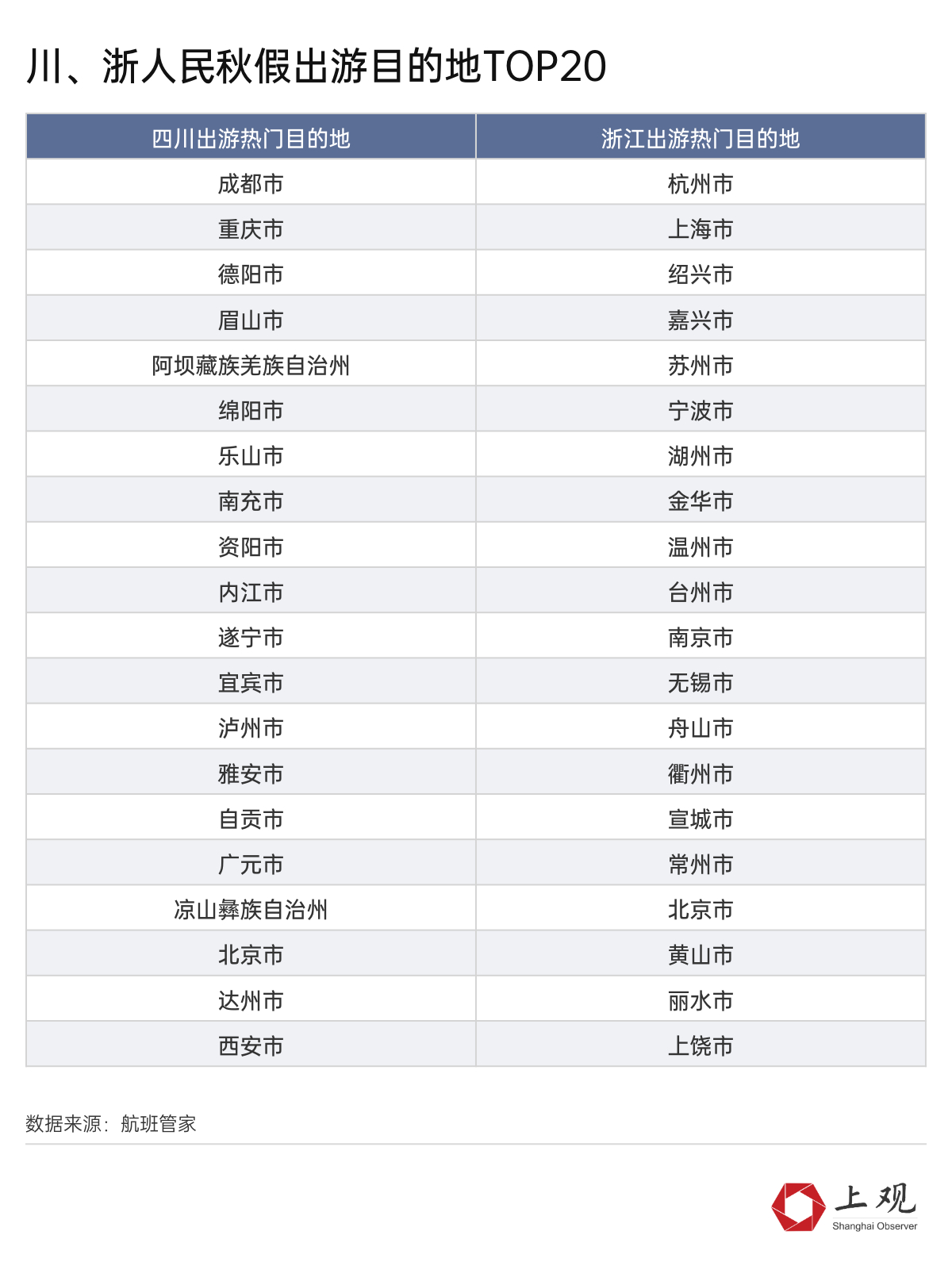 从航班管家DAST交通数据来看,四川省的出游目的地前五名为:成都、重庆、德阳、眉山、阿坝州。浙江省出游目的地前五名为:杭州、上海、绍兴、嘉兴、苏州。