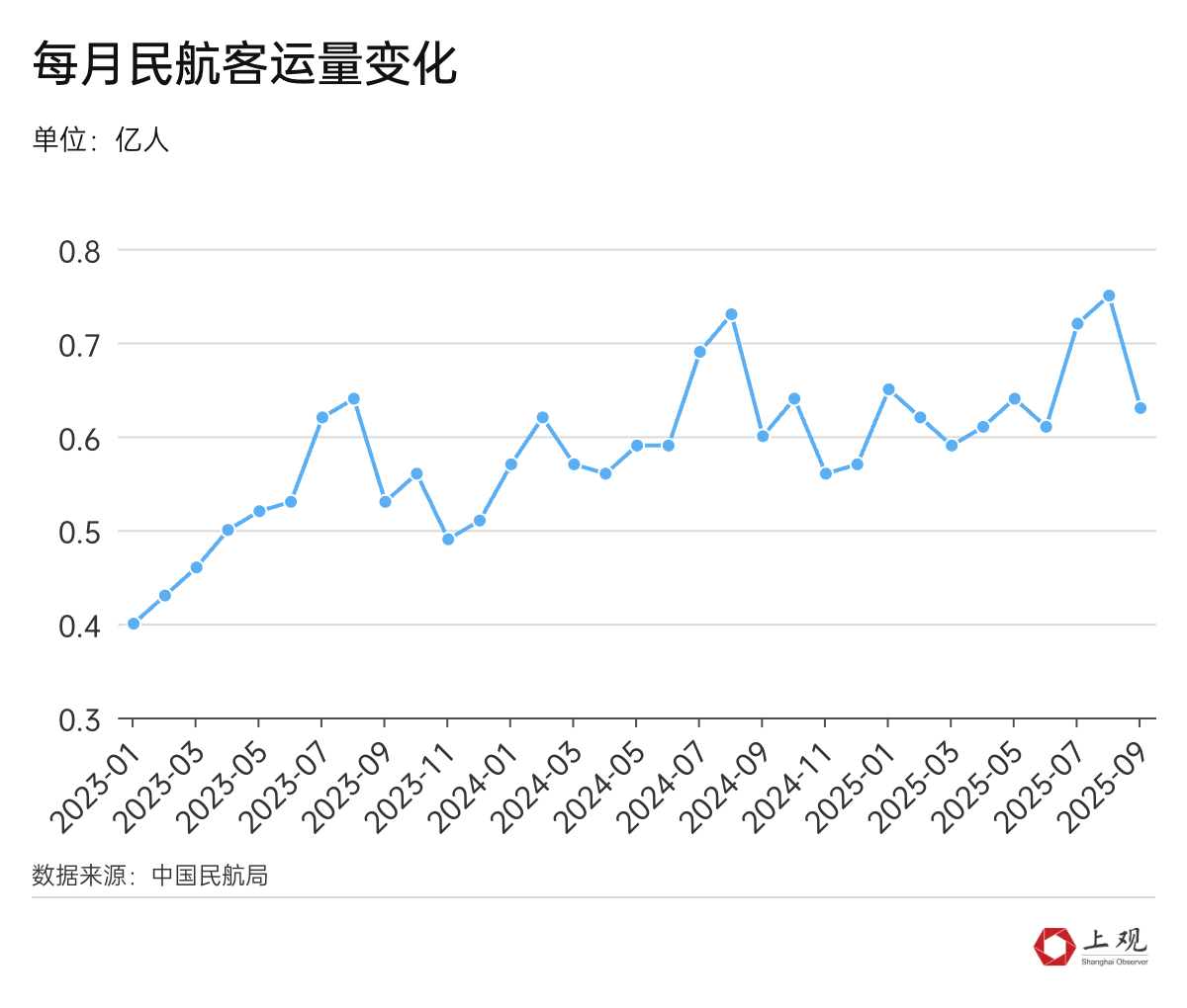 从历史的民航客运量数据来看,暑运、春运、寒假等时间段都是出行高峰,而春秋季则是淡季,特别是11月往往是客运量的低谷。但今年的秋假期间(监测范围为11月10日至16日)有所升温,航班管家数据显示,整周民航平均客座率约85.5%,环比上周上涨0.2%,比2024年同期高1.4个百分点。