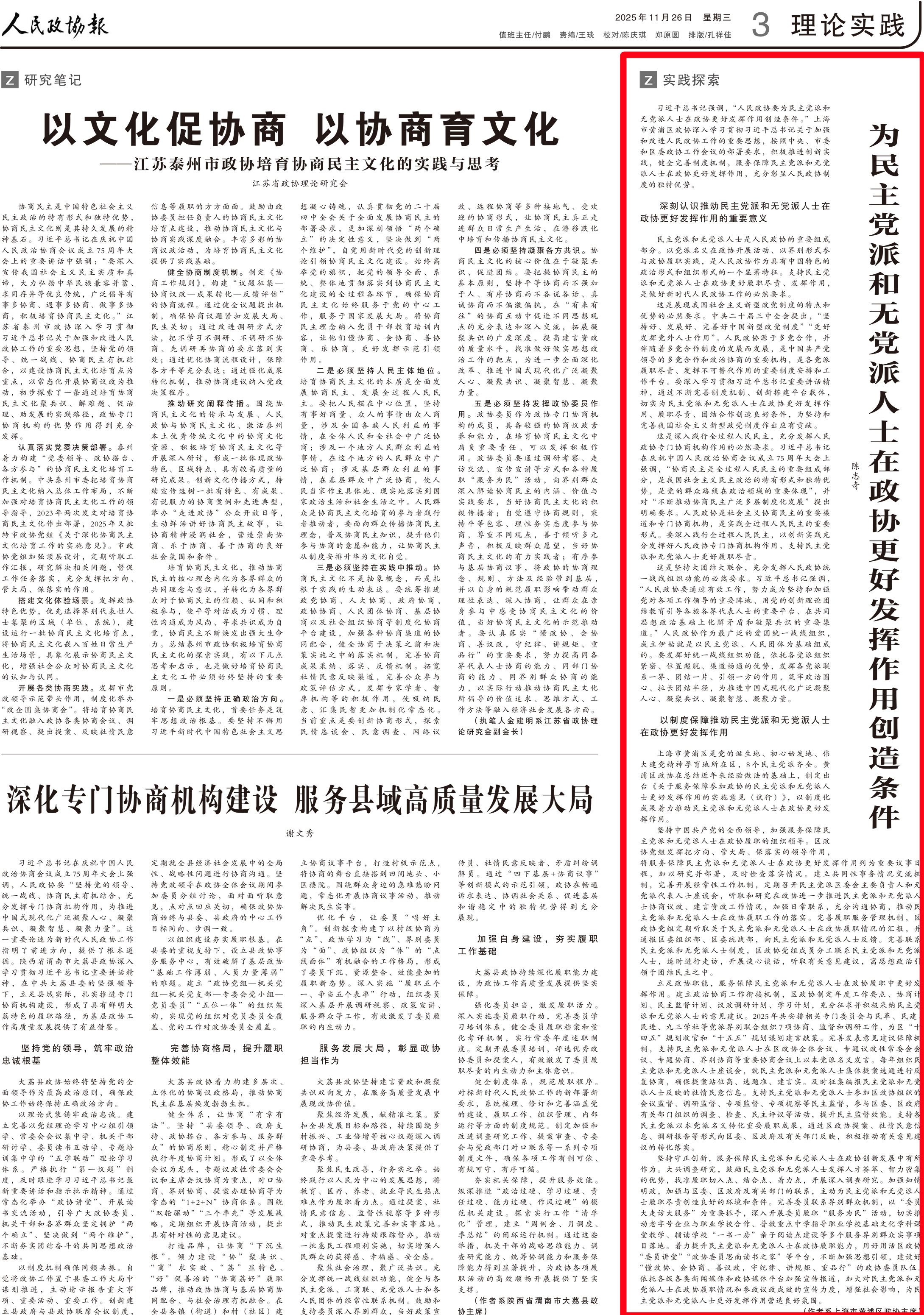 立足政协职能,服务保障民主党派和无党派人士在政协履职中更好发挥作用。建立政治协商工作衔接机制,区政协制定年度工作要点、协商计划、民主监督计划、议政调研计划、学习计划,充分征求并积极采纳民主党派和无党派人士的意见建议。2025年共安排相关专门委员会与民革、民建、民进、九三学社等党派界别联合组织7项协商、监督和调研工作,为区“十四五”规划收官和“十五五”规划谋划建言献策。完善发表意见建议保障机制,支持民主党派和无党派人士在区政协全体会议、专题议政性常委会会议、专题协商、界别协商等重要协商会议上以本党派名义发言。每年组织民主党派和无党派人士座谈会,就民主党派和无党派人士集体提案选题进行反复协商,确保提案站位高、选题准、建言实。及时征集编报民主党派和无党派人士反映的社情民意信息。支持民主党派和无党派人士参加区政协组织的会议监督、调研监督、专项监督、专项视察等民主监督,参与区委、区政府有关部门组织的调查、检查、民主评议等活动,提升民主监督效能。支持各民主党派以本党派名义转化重要履职成果,通过区政协提案、社情民意信息、调研报告等形式向区委、区政府及有关部门反映,积极推动有关意见建议的转化落实。