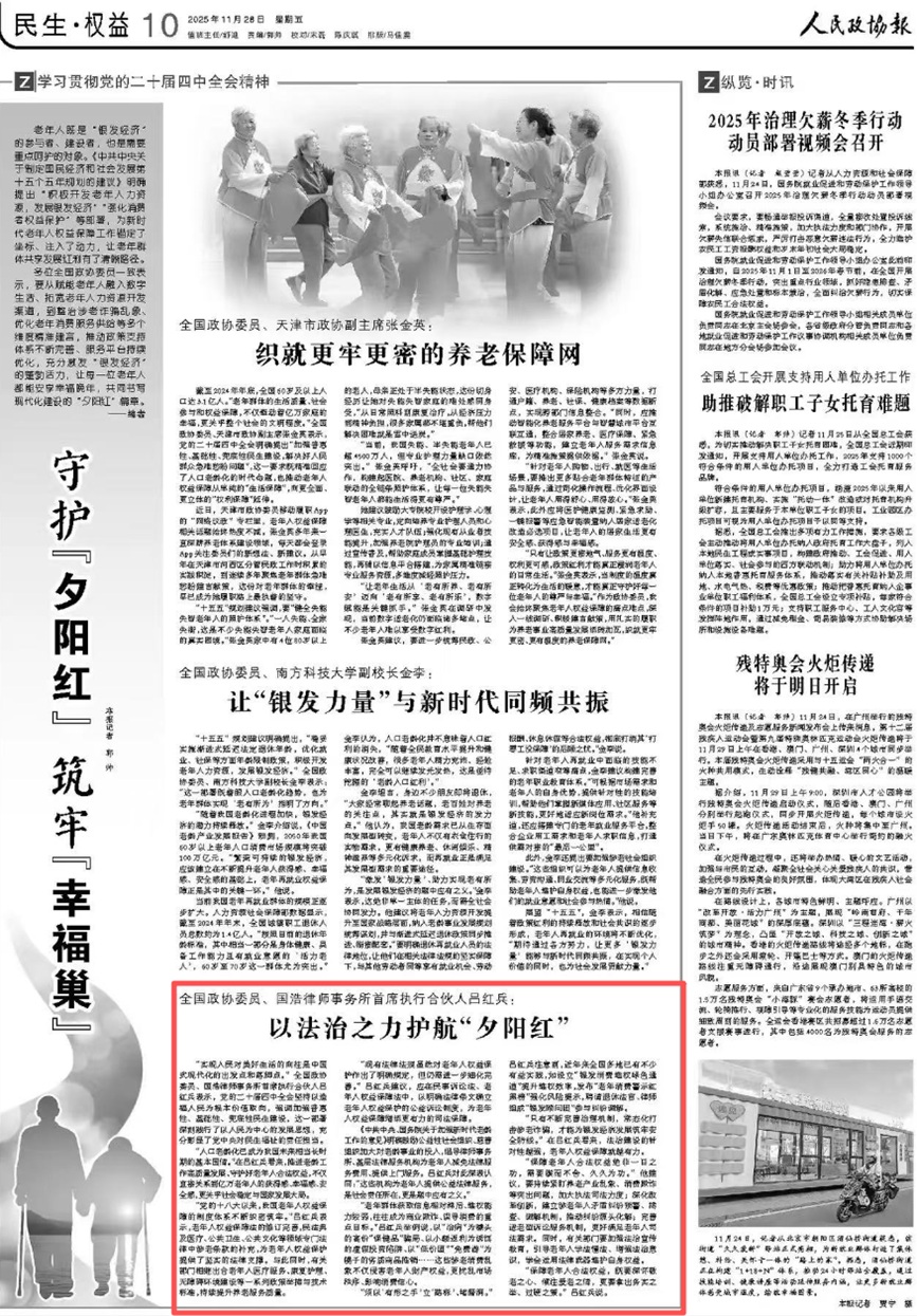 “保障老年人合法权益绝非一日之功,需要锲而不舍、久久为功。”他建议,要持续紧盯养老产业乱象、消费欺诈等突出问题,加大执法司法力度;深化改革创新,建立涉老年人矛盾纠纷预警、排查、调解机制,推动纠纷源头化解;完善适老型诉讼服务机制,更好满足老年人司法需求。同时,有关部门要加强法治宣传教育,引导老年人学法懂法、增强法治意识,学会运用法律武器维护自身权益。
