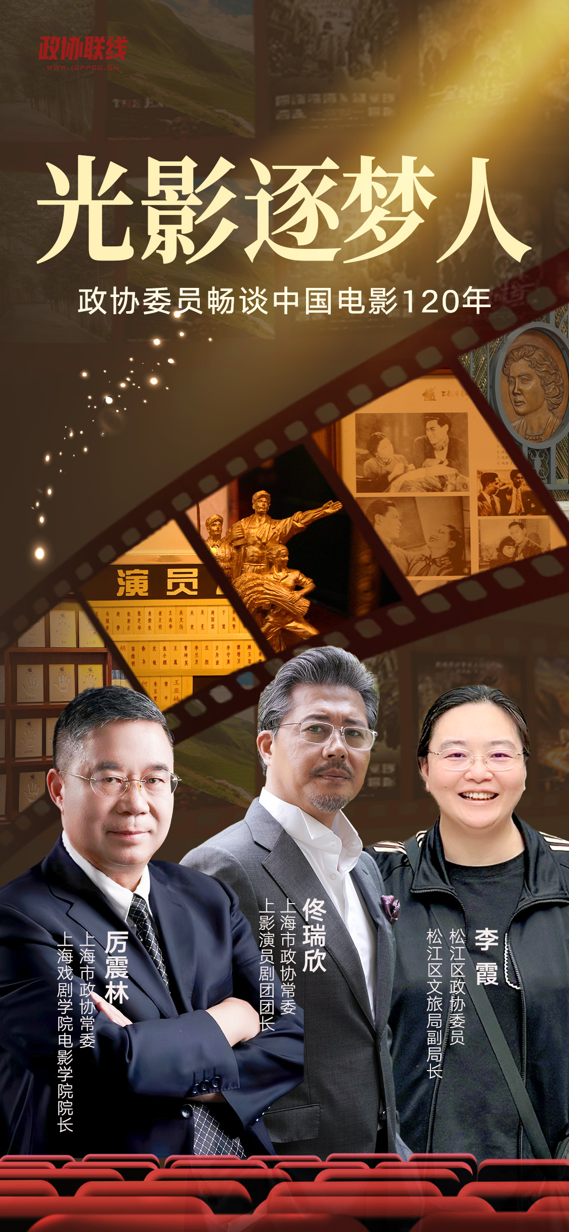 今年是中国电影走过的第一百二十个年头,两个甲子的岁月里,上海,这座曾被誉为“东方好莱坞”的电影之城,无数电影人用才华与生命点燃银幕之光。自新中国成立以来,这群优秀的电影人里,又多出了一个共同的名字——政协委员,他们用自己的赤子之心,孜孜不倦地追求着光影编织的梦想。近日,政协联线走访了数位来自不同电影工作岗位的市、区政协委员,让我们一起听听,他们眼中的中国电影120年。