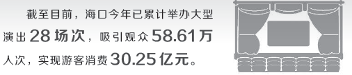 看演出、玩游戏、品美食、赏烟花……从白天到深夜,来自河南的小林与朋友一起沉浸式体验了海口的国际化演艺氛围。今年11月底,两位艺人在海口同期开唱,短短3天,4场大型演出相继上演,吸引观众超过12万人次。截至目前,海口今年已累计举办大型演出28场次,吸引观众58.61万人次,实现游客消费30.25亿元。