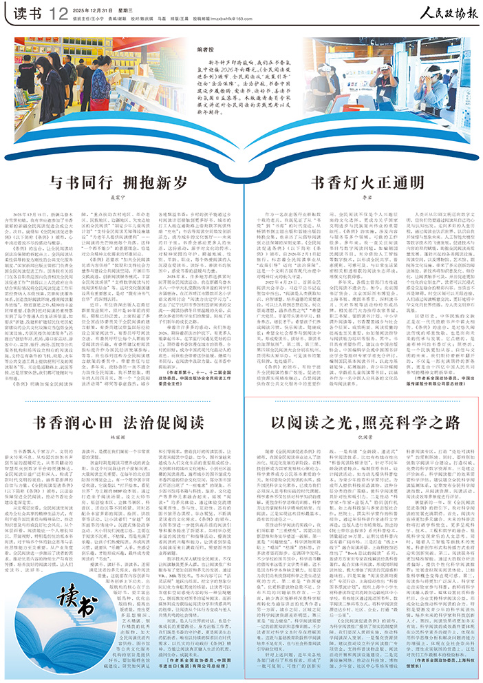 展望新的一年,在《全民阅读促进条例》的指引下,我对科学阅读的发展充满期待。首先,阅读内容将更加多元融合。未来的科普读物将打破学科壁垒,更多呈现科学、技术、工程和数学的融合,展现科学发现背后的人文思考。同时,随着人工智能等新技术的发展,科普创作形式和传播方式也将迎来创新突破。第二,阅读服务将更加精准智能。通过大数据分析读者偏好,提供个性化科学阅读推荐;发展虚拟现实阅读体验,让抽象科学概念变得直观可感。第三,阅读参与将更加广泛深入。科学家走出实验室参与科普,教师将科学阅读融入教学,媒体设置优质科普栏目,企业支持科学阅读公益,形成全社会推动科学阅读的合力。特别是要激发青少年的科学阅读热情,培养未来的科学家和科技创新人才。第四,阅读效果将更加务实有效。科学阅读的成效最终要体现在公民科学素养的提升上,体现在用科学思维分析和解决问题的能力的增强上,体现在全社会崇尚科学、理性求实氛围的营造上。这是对我们工作最根本的检验标准。