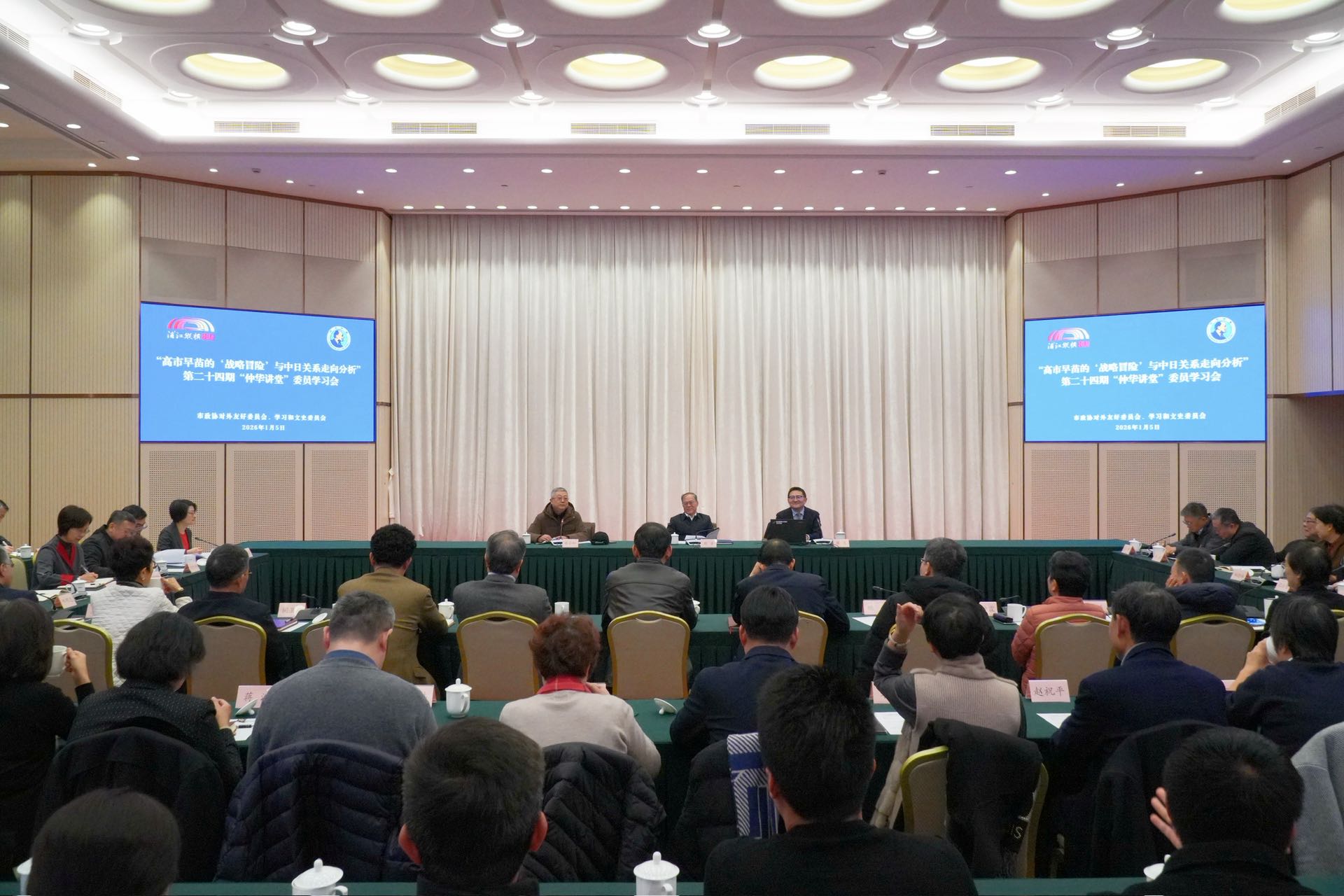 1月5日上午,上海市政协对外友好委员会、学习和文史委员会联合举办 “浦江纵横大讲堂”暨第二十四期“仲华讲堂”委员学习会。上海国际问题研究院东北亚研究中心主任、外交政策研究所中国外交室主任蔡亮应邀作“高市早苗的‘战略冒险’与中日关系走向分析”专题报告。学习会上,蔡亮结合当前国际地区形势,对日本国内政治动态、相关政治人物的政策取向及其对中日关系的潜在影响进行了深入剖析,并对中日两国关系未来走向作了前瞻性展望。在随后的互动环节,与会委员就共同关心的中日经贸合作、民间交流等话题与专家进行了探讨。