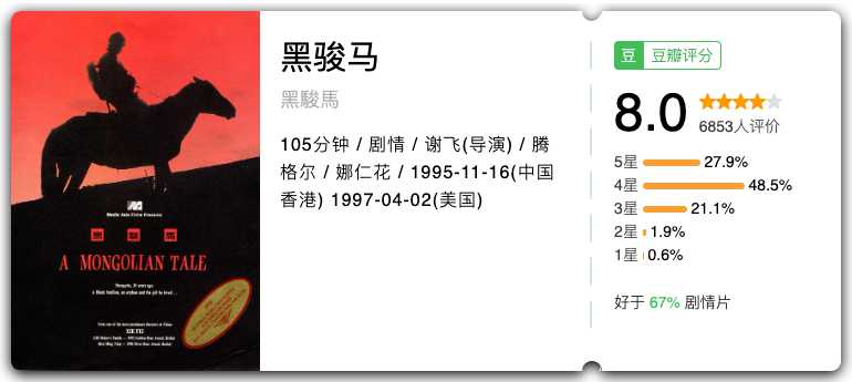 关键词:草原文明、成长释怀、黑骏马影片由谢飞执导,改编自张承志同名小说,以黑骏马为精神与叙事载体,跟随主角白音宝力格的脚步,串联起他与索米娅的草原爱情、离别与归乡。影片借骏马见证草原的变迁与人的成长。
