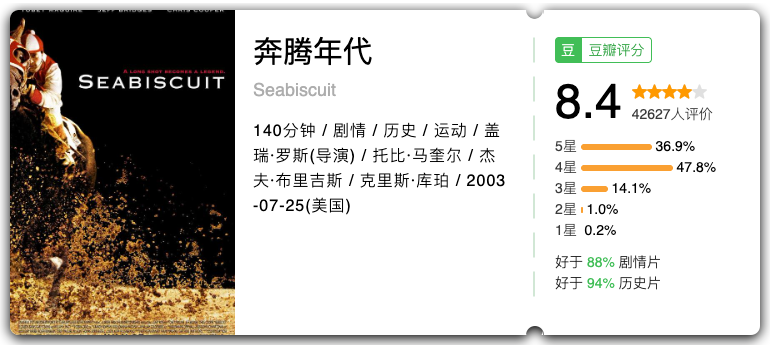 关键词:大萧条、逆袭、希望改编自真实历史事件,讲述了一匹身材矮小、脾气暴躁的赛马“海洋饼干”,与三位同样失意的男人——驯马师、骑师和老板,在经济大萧条时期相互救赎、创造奇迹的故事。海洋饼干的每一次奔跑,都承载着一个民族的希望,它证明了即使身处绝境,只要不放弃,就能创造属于自己的辉煌。